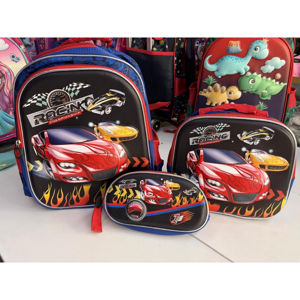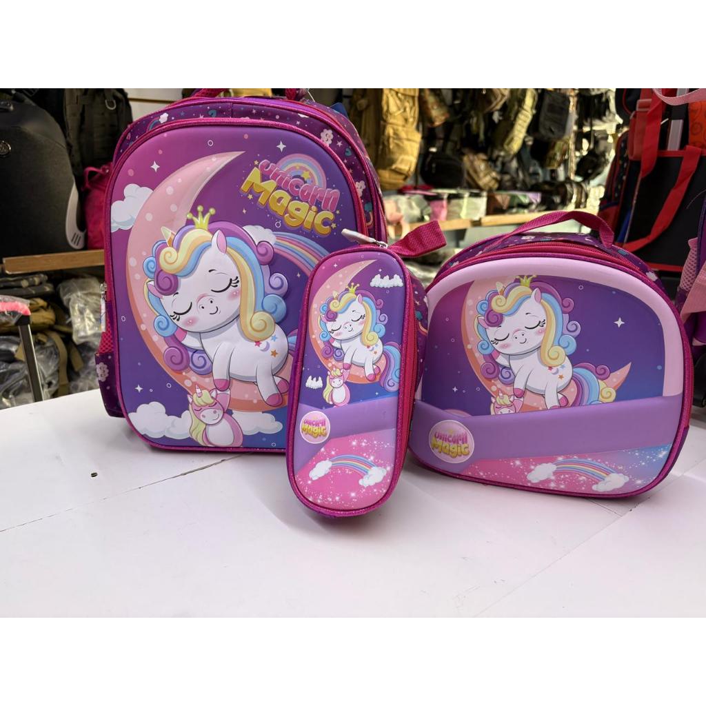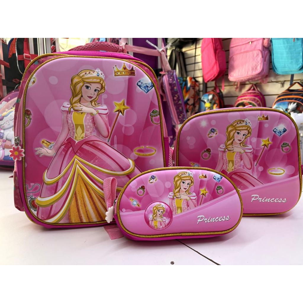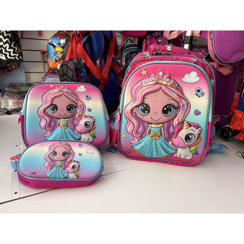 Kit Infantil Escolar c/ Mochila Lancheira Térmica e Estojo Diversos Temas (Dinossauro/Princesas/Jhully/Carros/Unicornio)