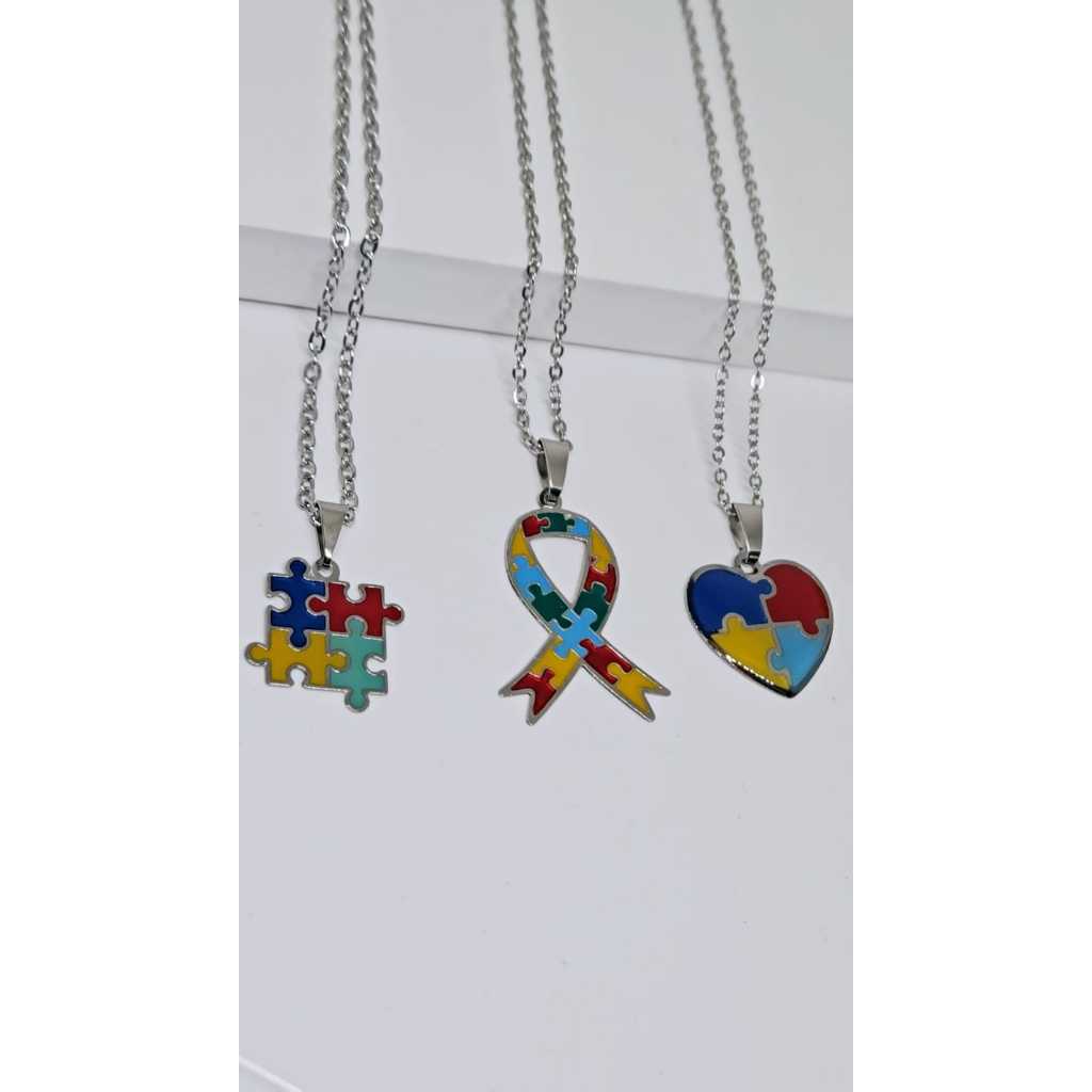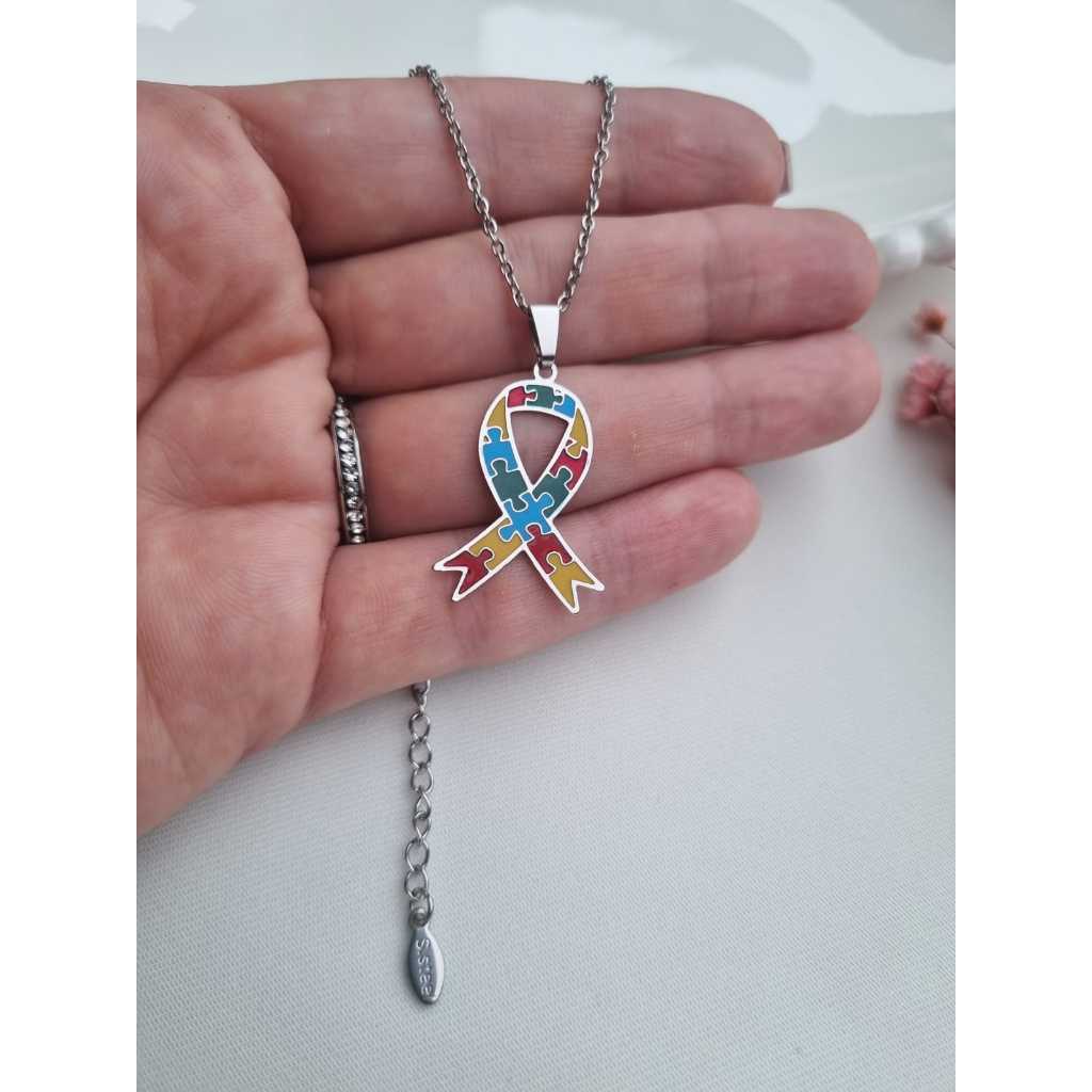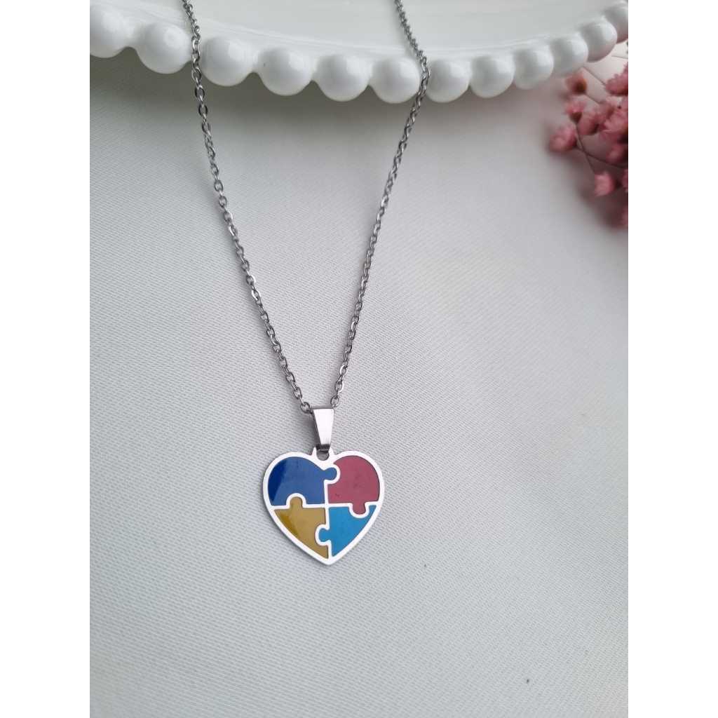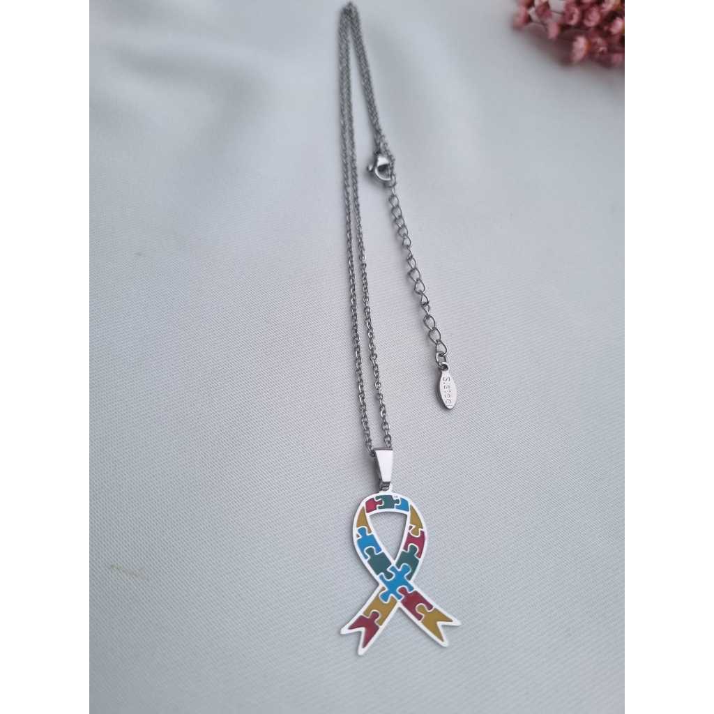 Colar Pingente Autismo Coração Lacinho Cordão Aço Inox Antialergico Conscientização Autista Cor Prata