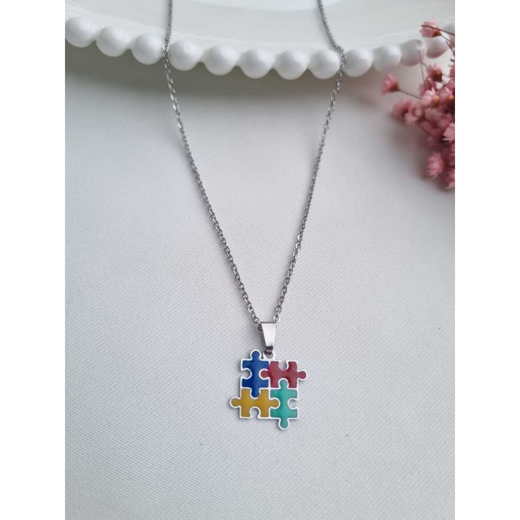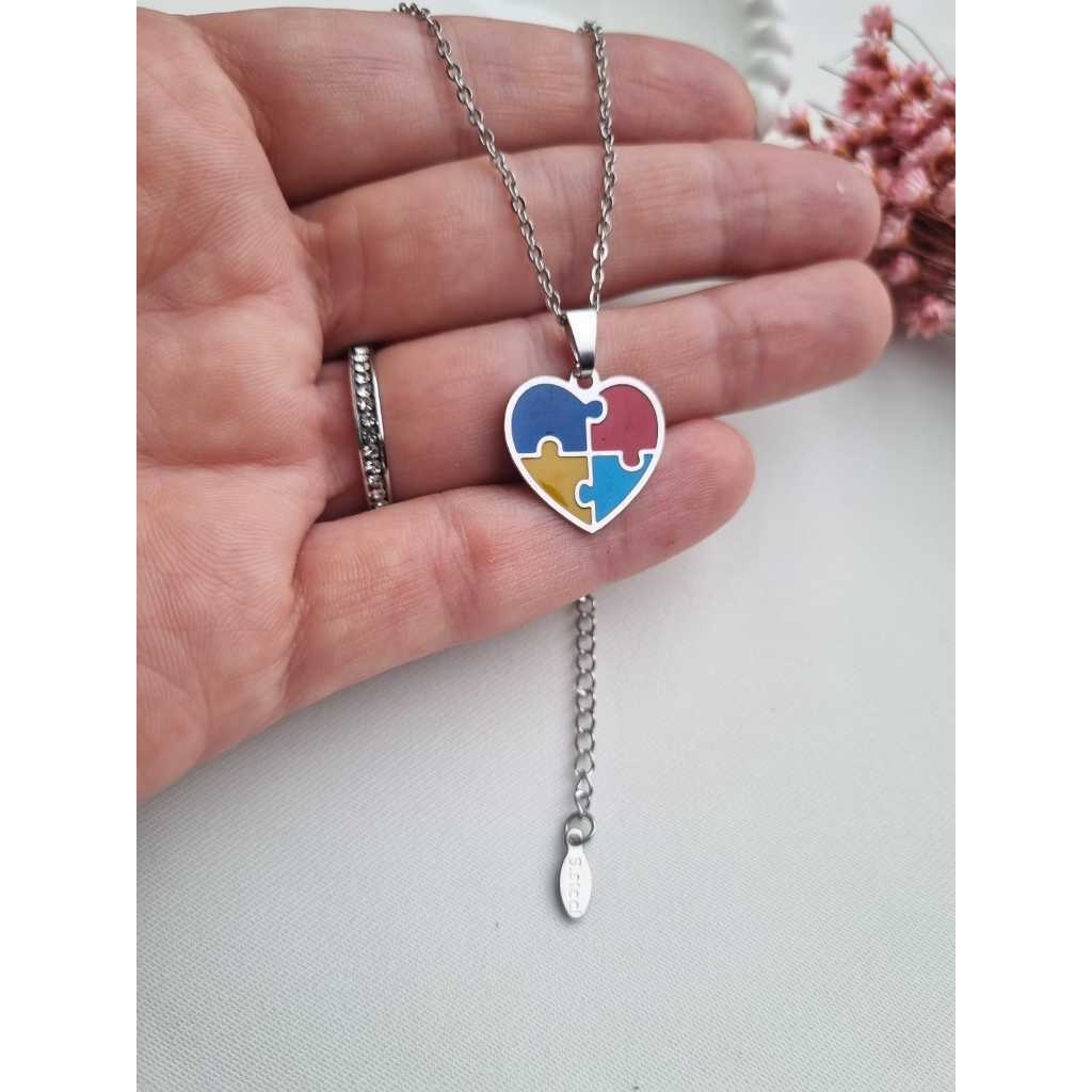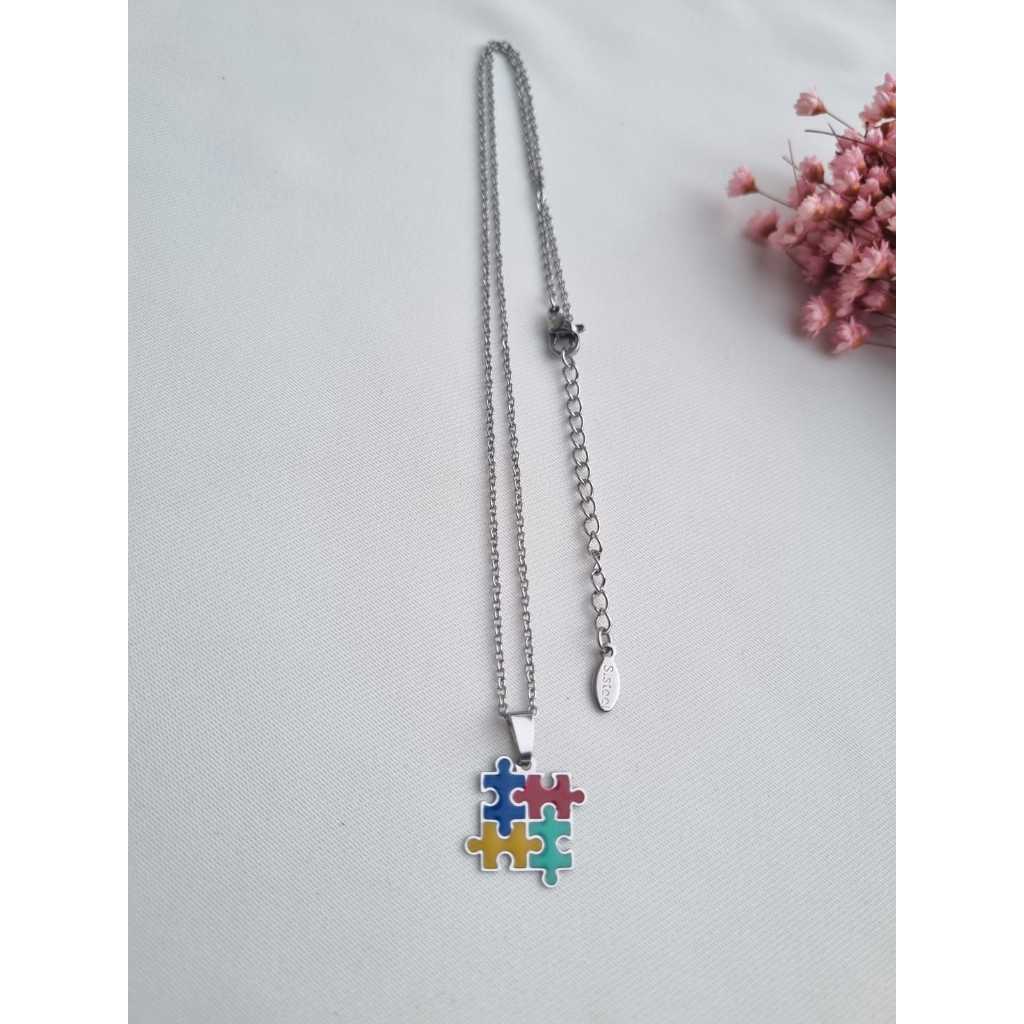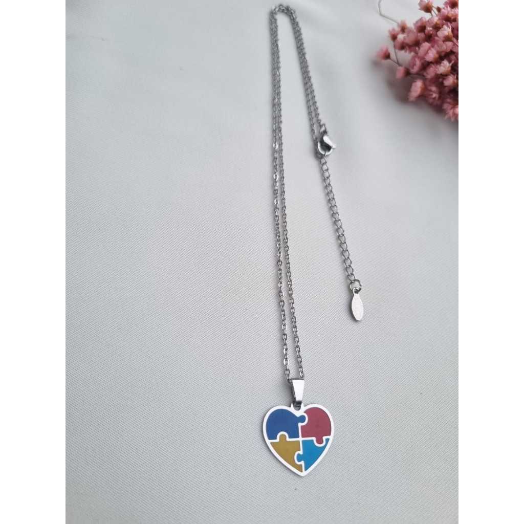 Colar Pingente Autismo Coração Lacinho Cordão Aço Inox Antialergico Conscientização Autista Cor Prata