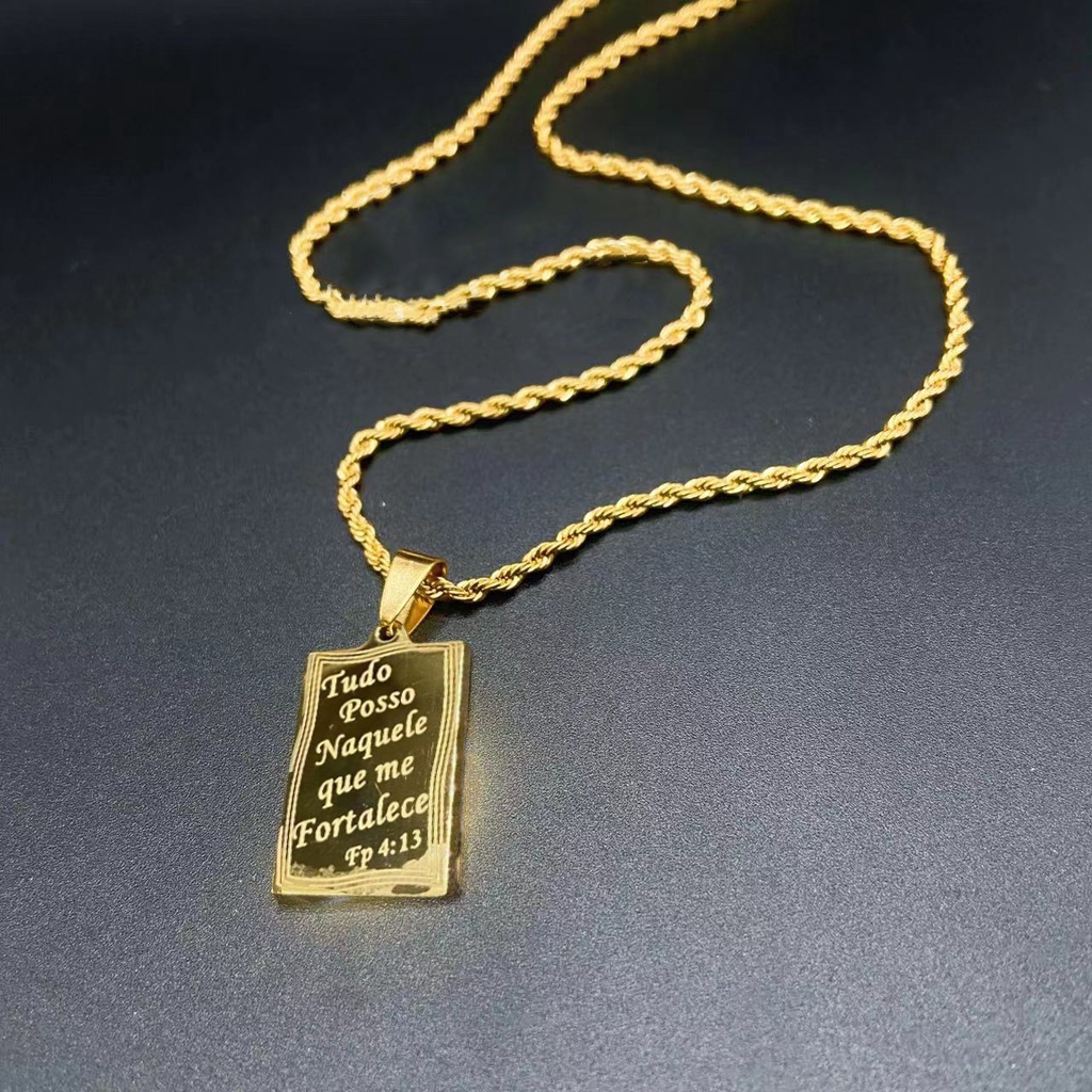 Corrente masculina de Bahiano Trançada aço inoxidável com pingente de Tudo posso Naquele Que Me Fortalece Dourado Aço inoxidável 316L