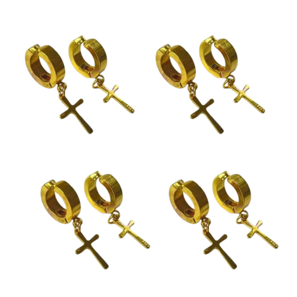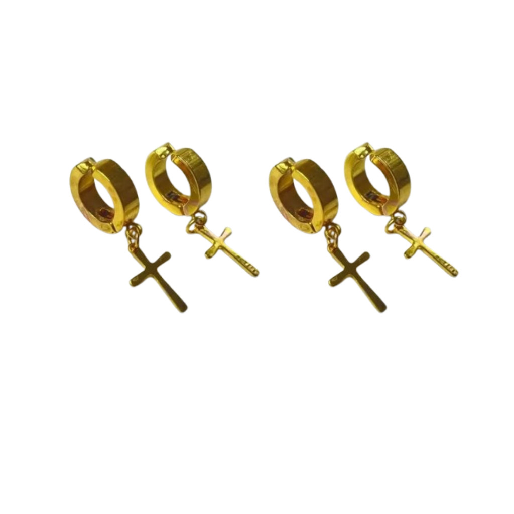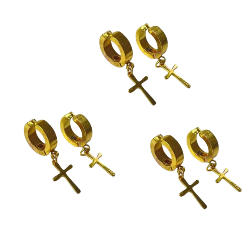 Brinco de Pressão Argola Aço Inoxidável Dourado Preto Prata com Cruz Masculino
