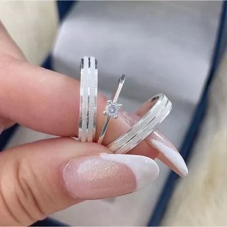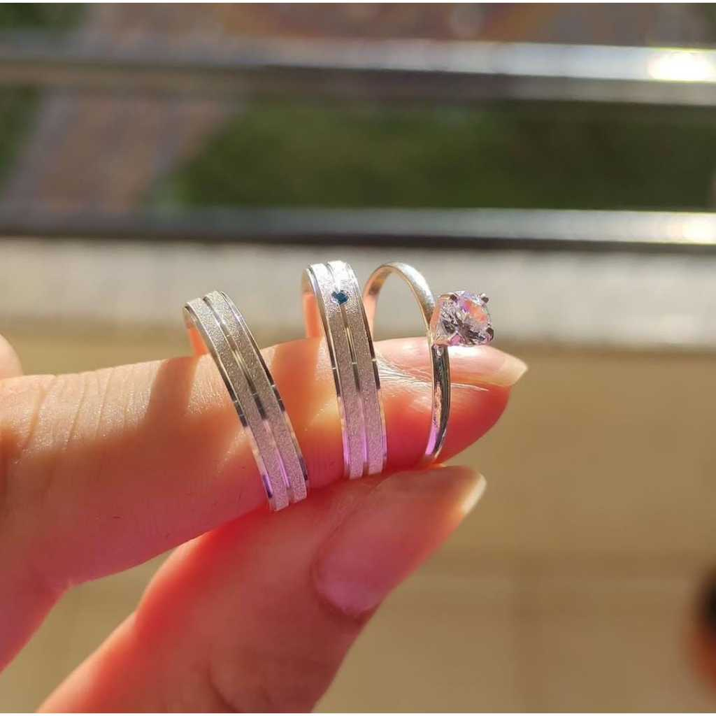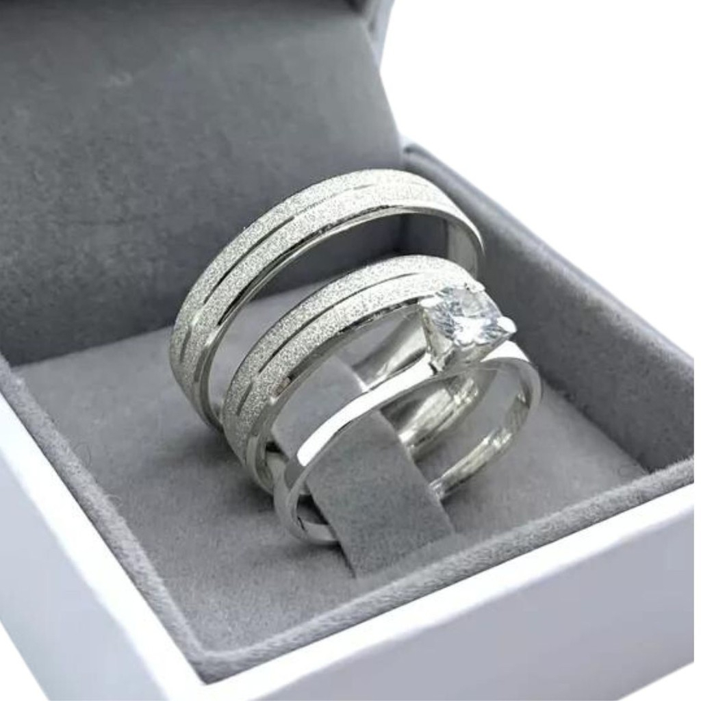 Par Aliança De Namoro Prata Diamantada 4mm + Anel Solitário Compromisso Aço Inoxidável 316L