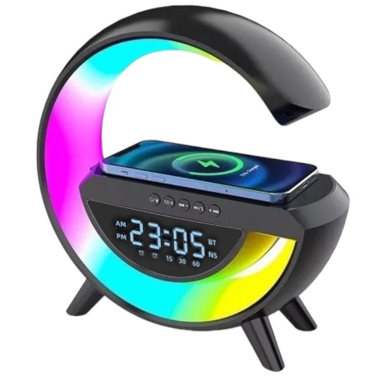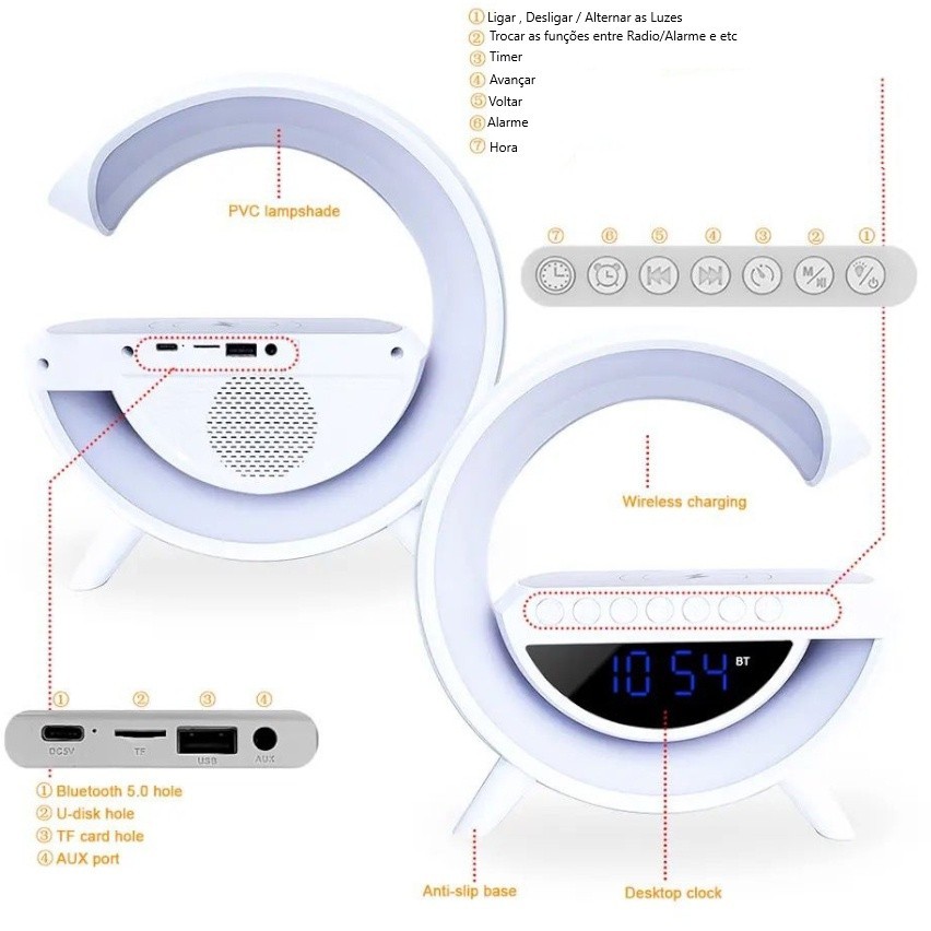 Luminaria G-Speaker Smart Rádio Carregador sem fio Wireless Relógio Auto falante Despertador Alarme