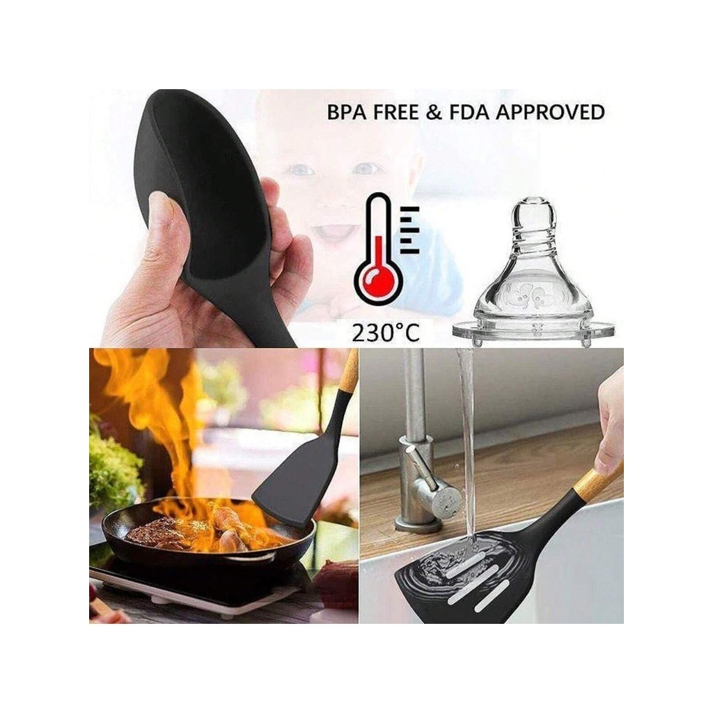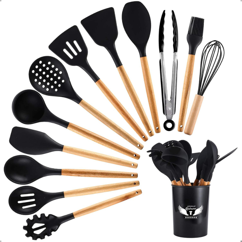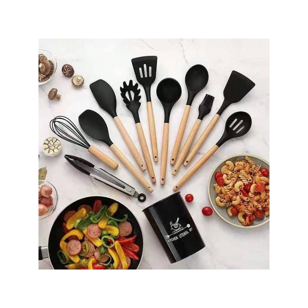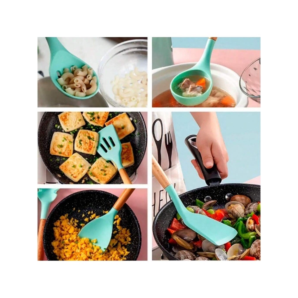 Kit 12 Peças Utensílios Cozinha Silicone Cabo Madeira decoração elegante livre BPA premium chef