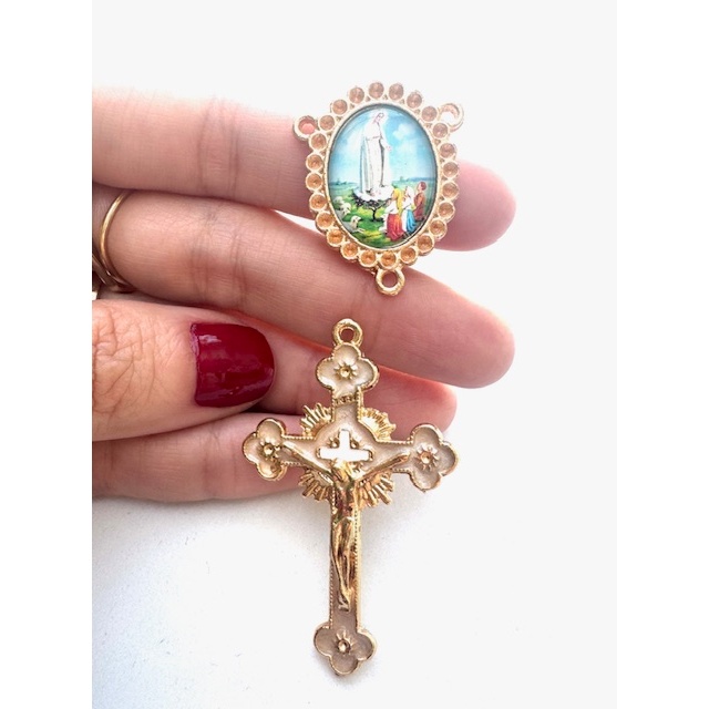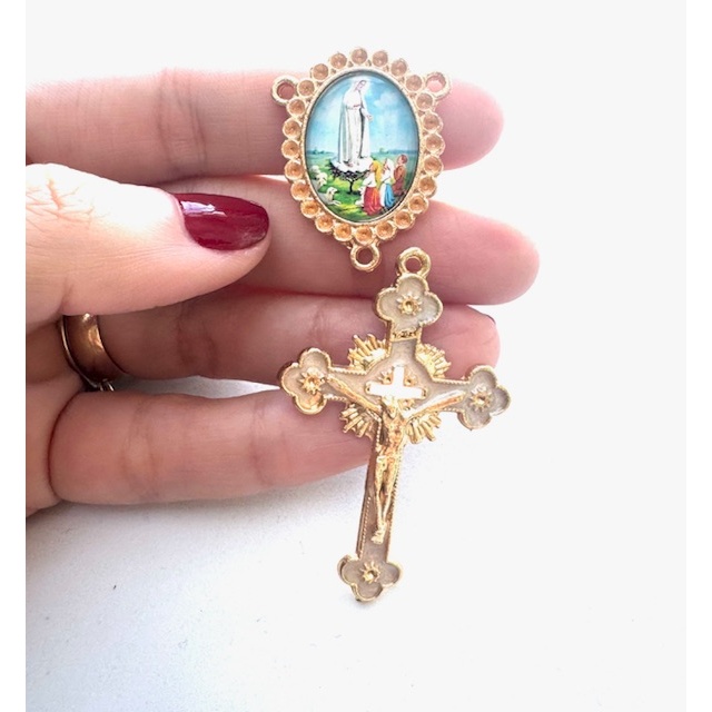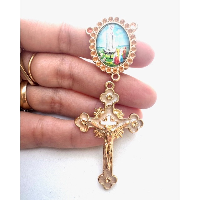 Kit Entremeio Nossa Senhora de Fátima e os Pastorinhos + Cruz Esmaltada (1 Dupla) - BANHO OURO CATAFORÉTICO - Nº292