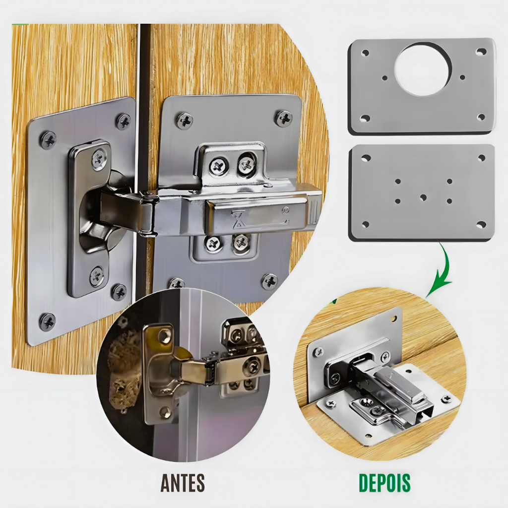 🛠️ Kit 10 Placas Para Reparo de Porta Fechada Dobradiça Armário MDF MDP Aço Inox + Parafusos