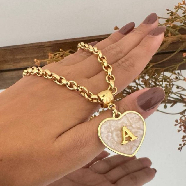 Colar com inicial corrente elo português pingente de coração madrepérola cordão moda feminina