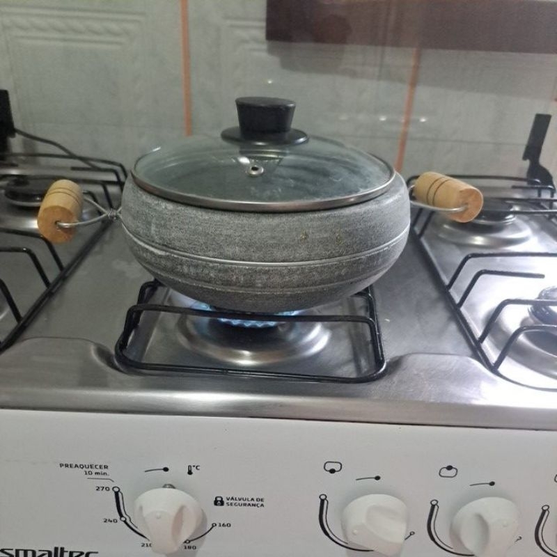 Panela De Pedra 1 Litro, Tampa De Vidro, Alça De Madeira