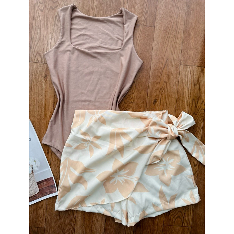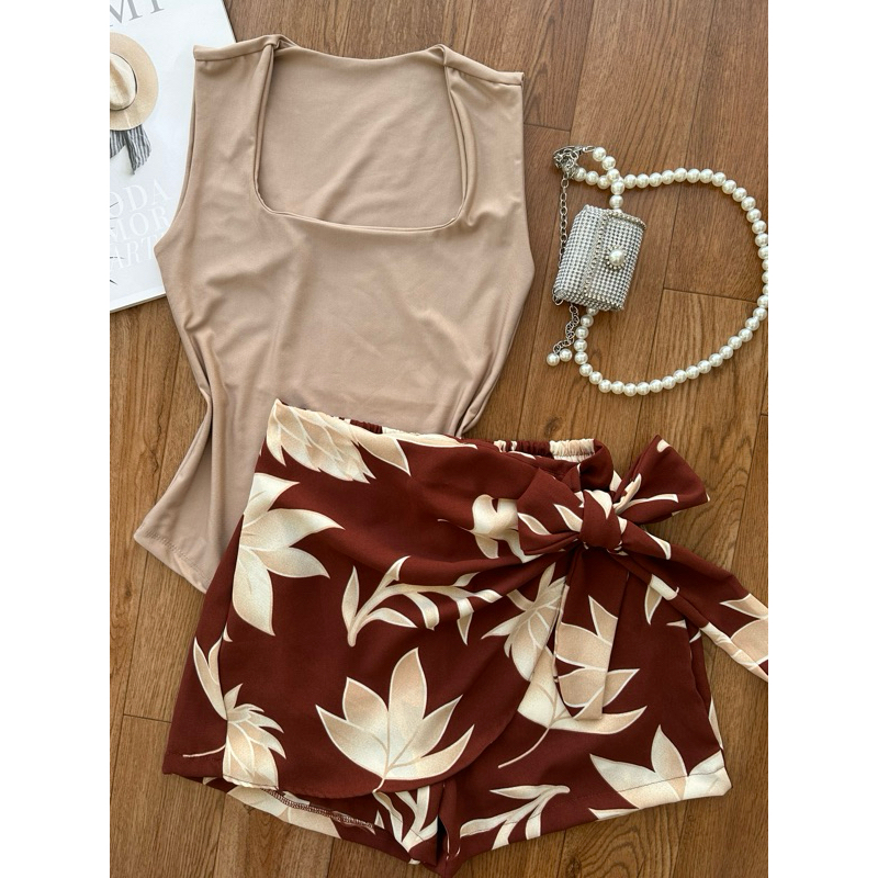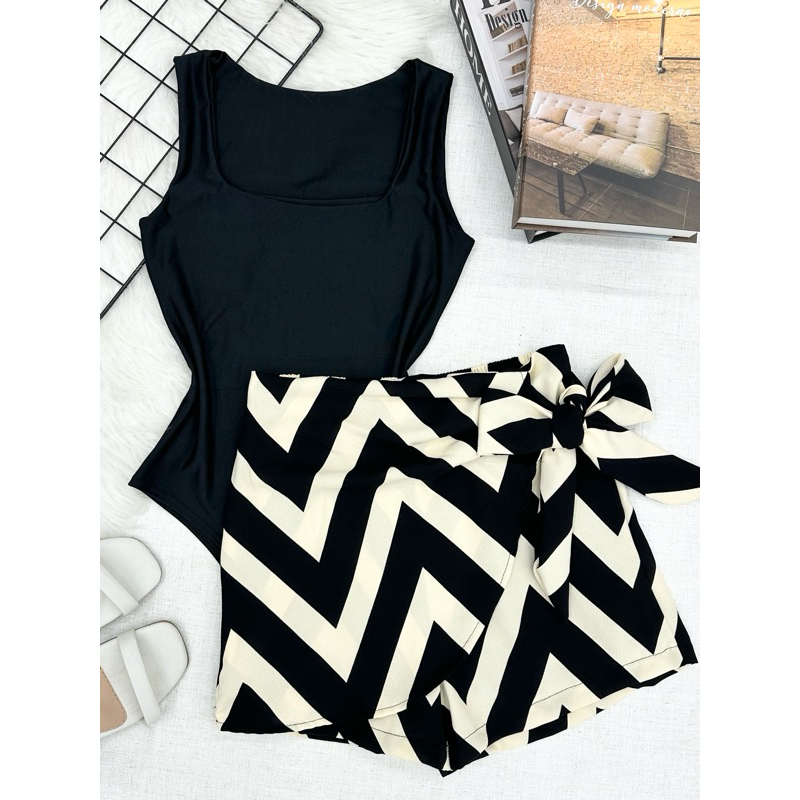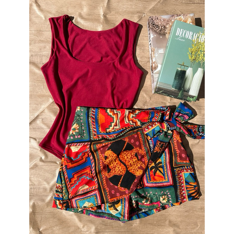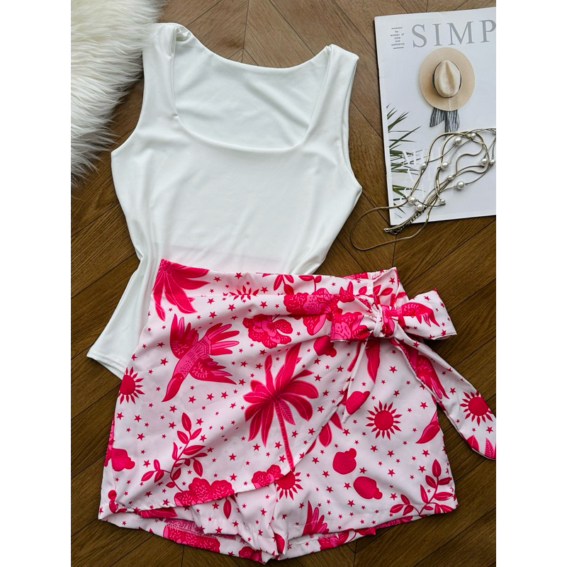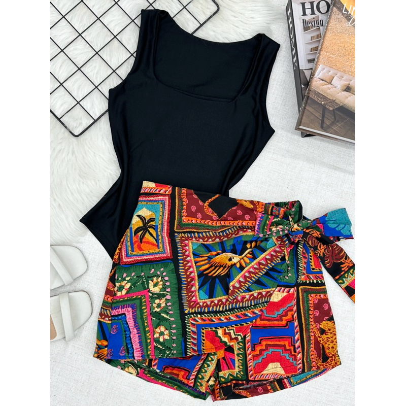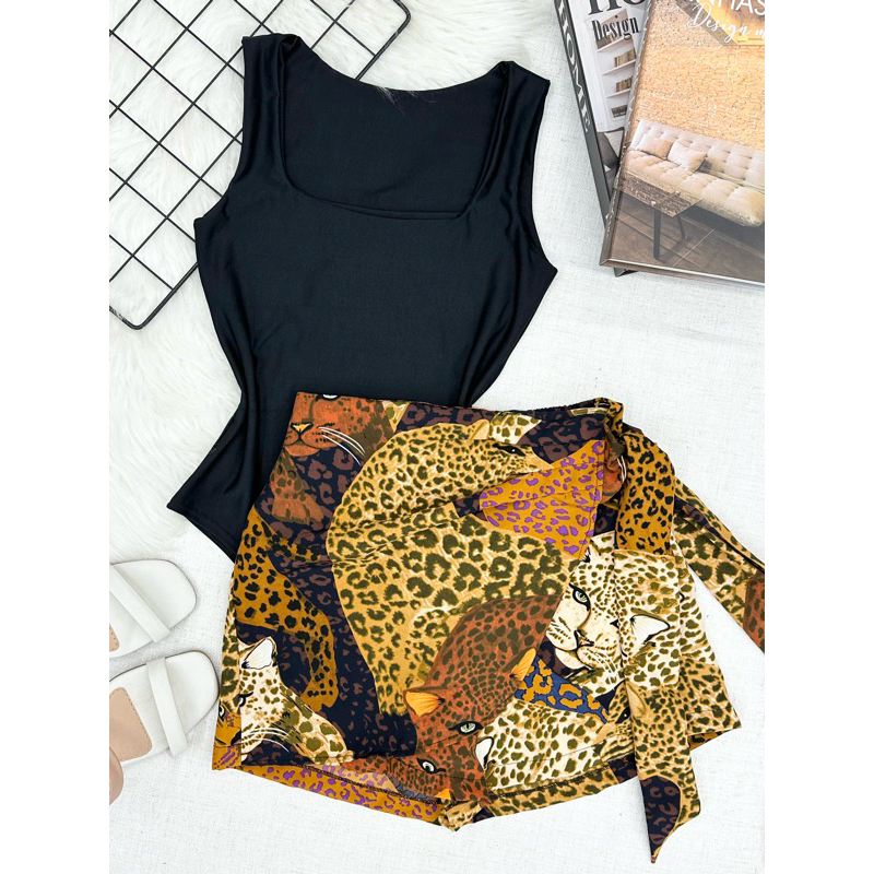 Conjunto de body suplex com saia com short estampado com forrado