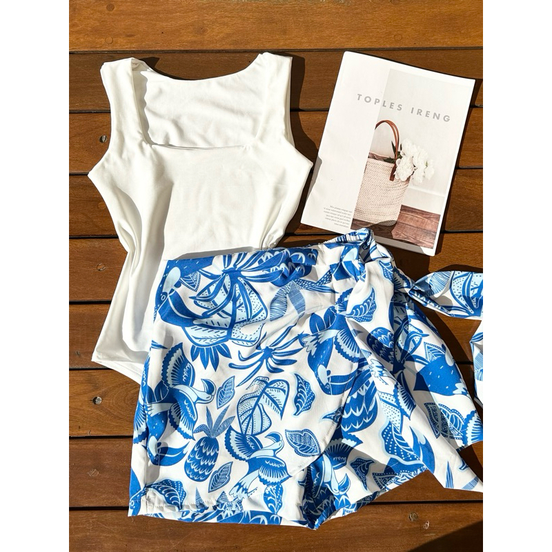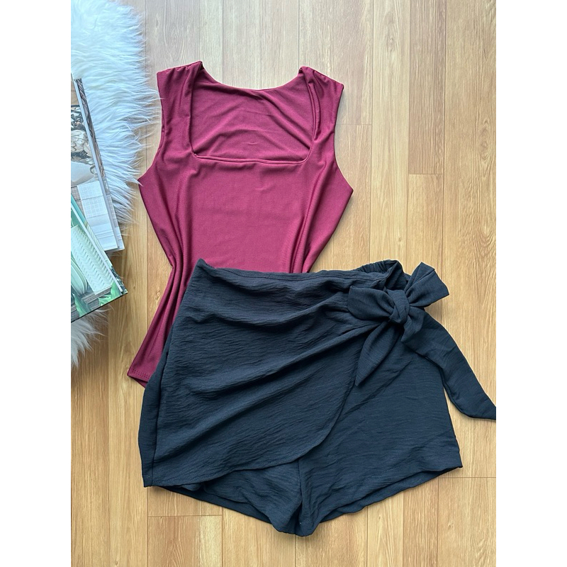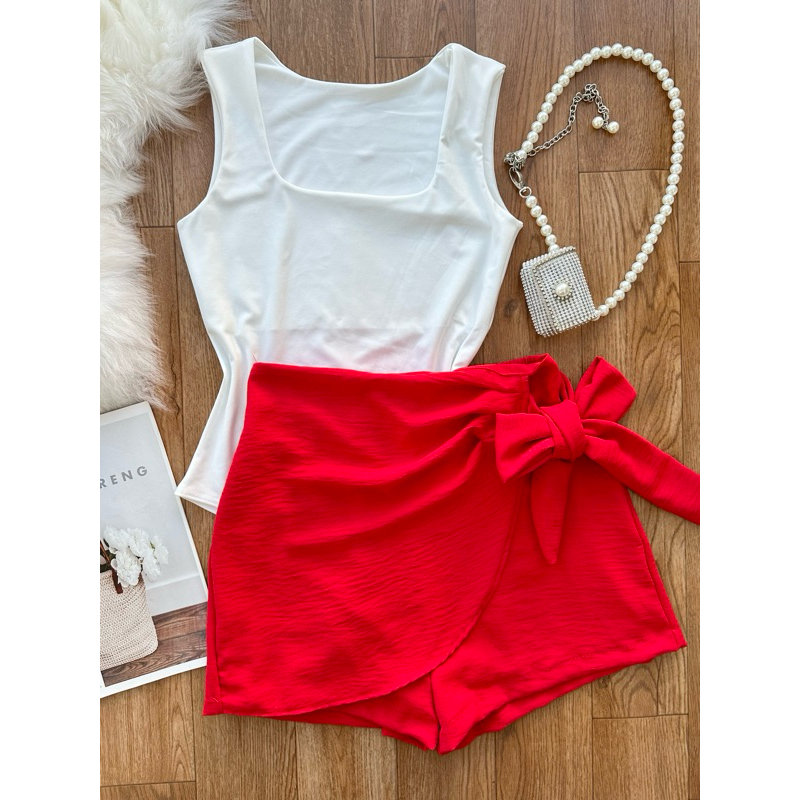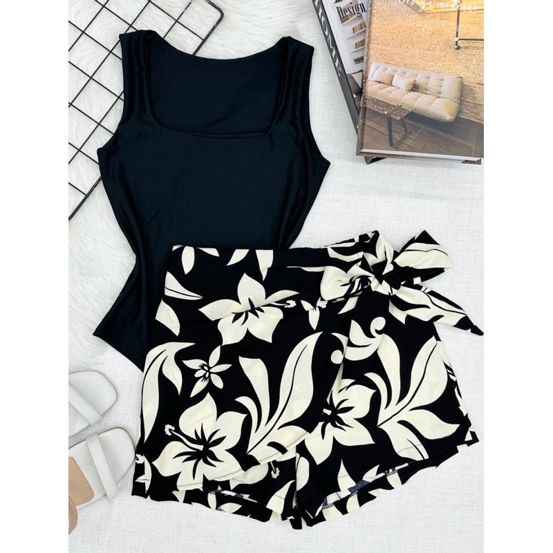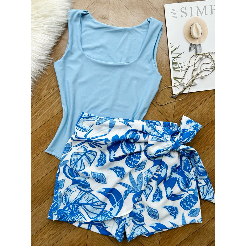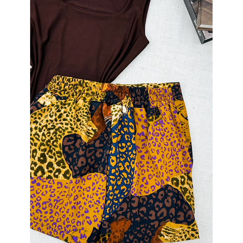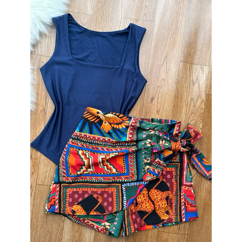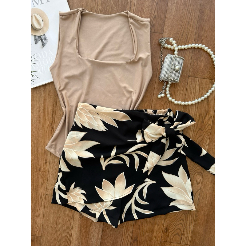 Conjunto de body suplex com saia com short estampado com forrado