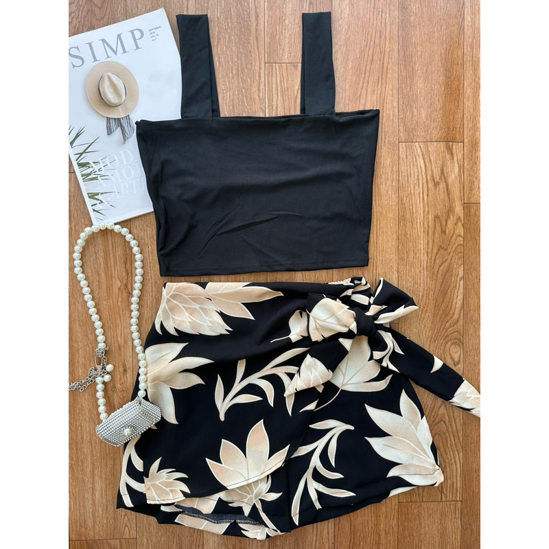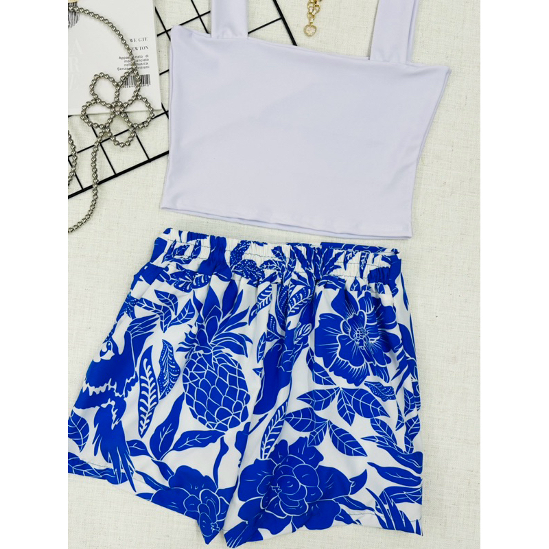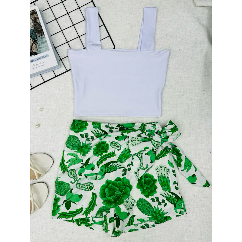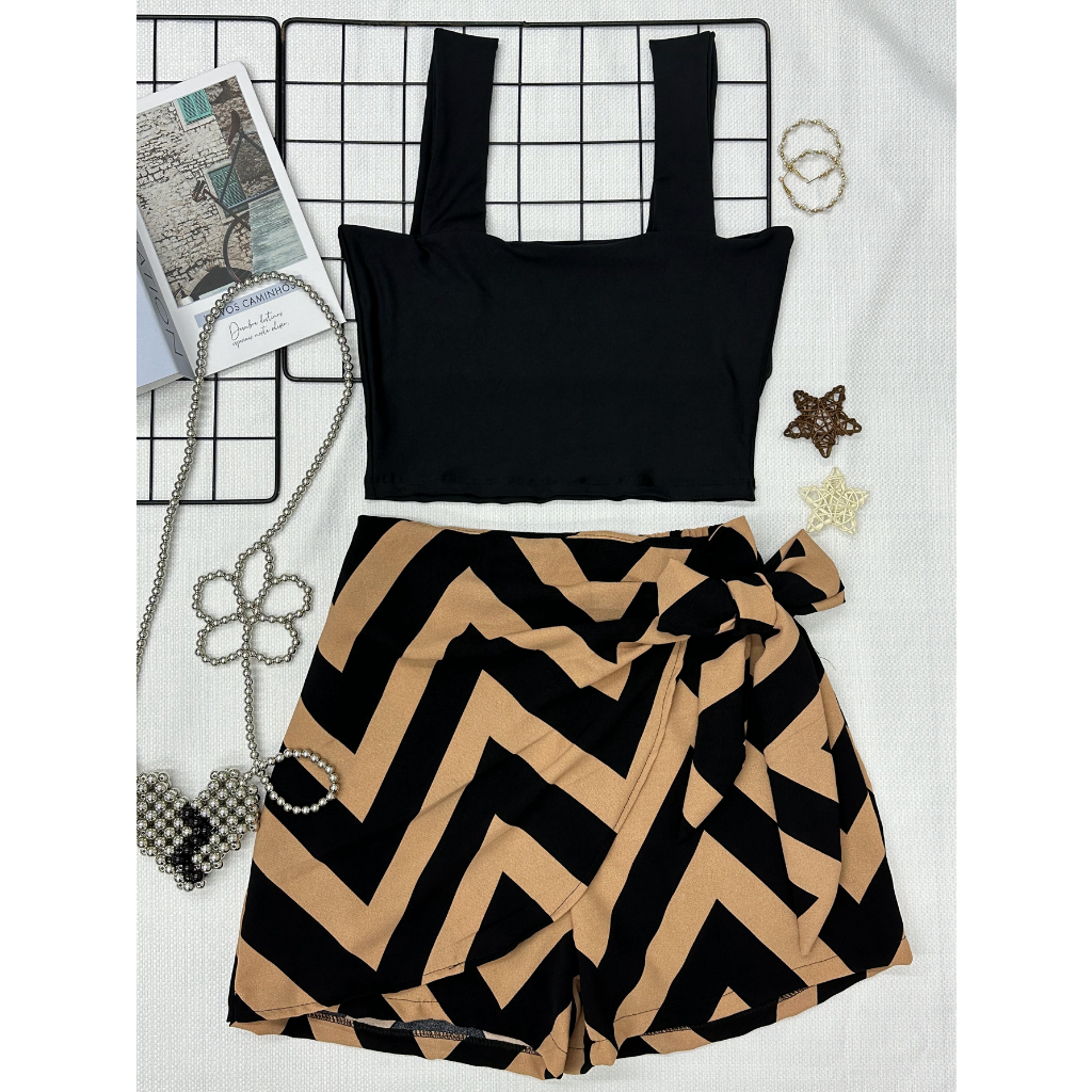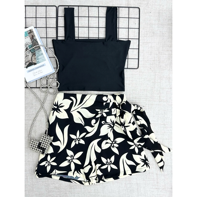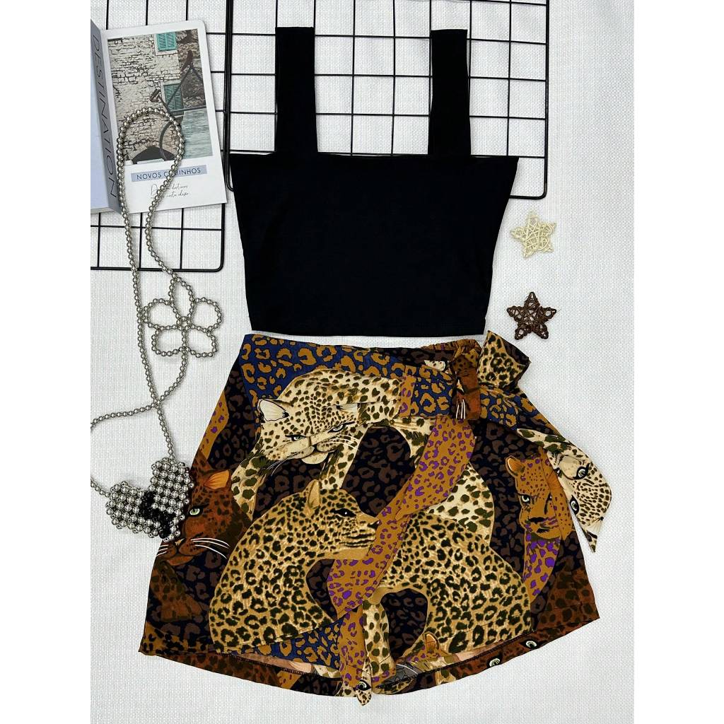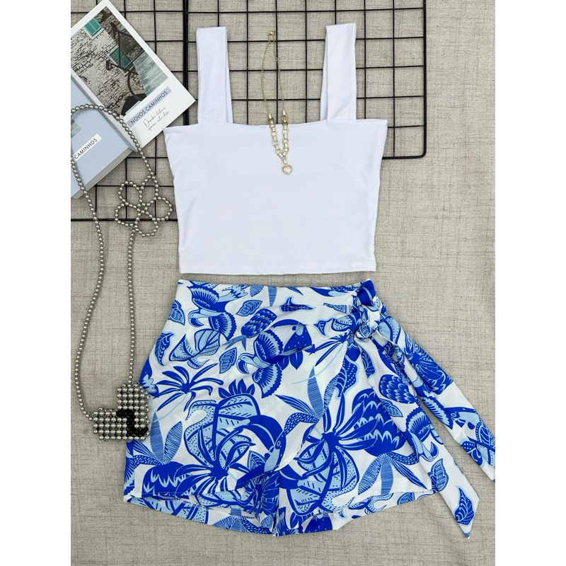 conjunto 2pcs de cropped suplex com saia com short estampado182
