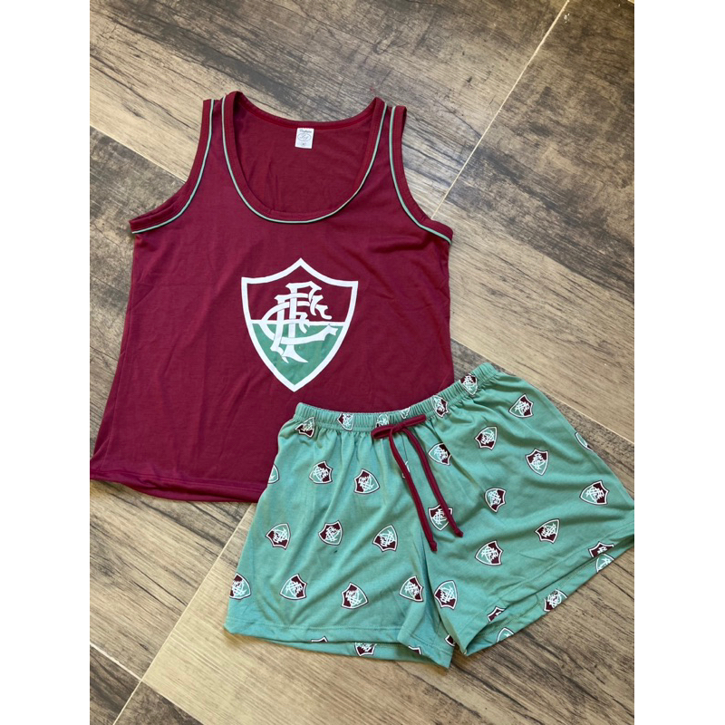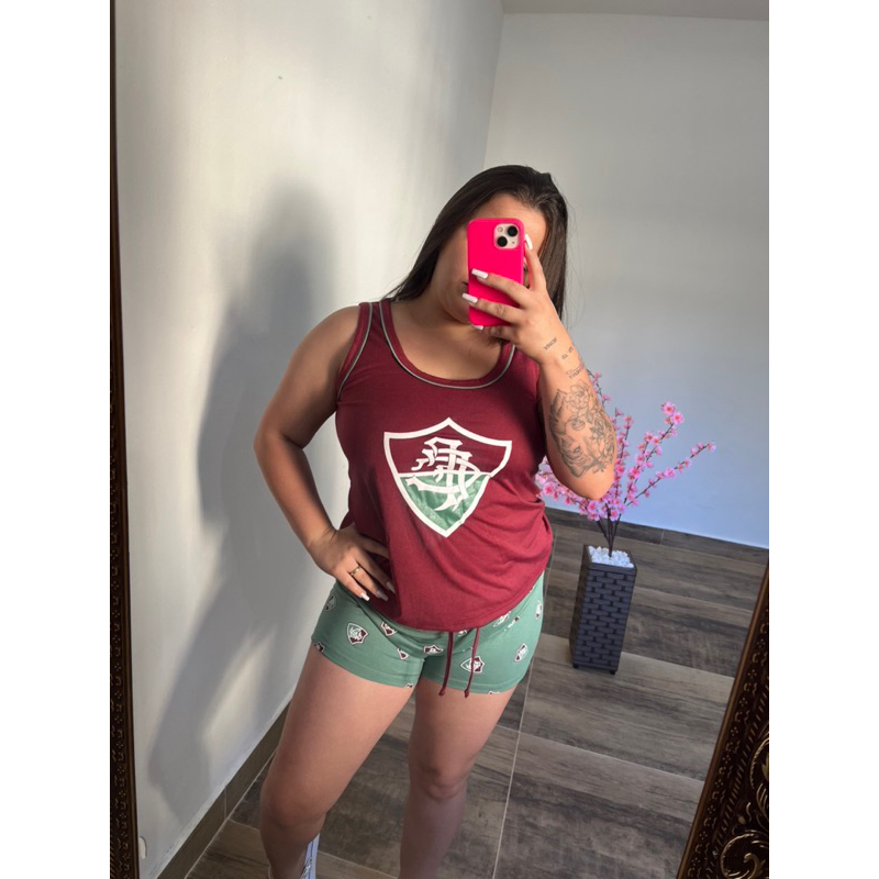 Pijama Fluminense Time de Futebol Baby Dool Feminino Adulto Regata de Malha Algodão Verão Primavera Atacado Revenda Sexy Short Blogueira Temático Personagem Disney