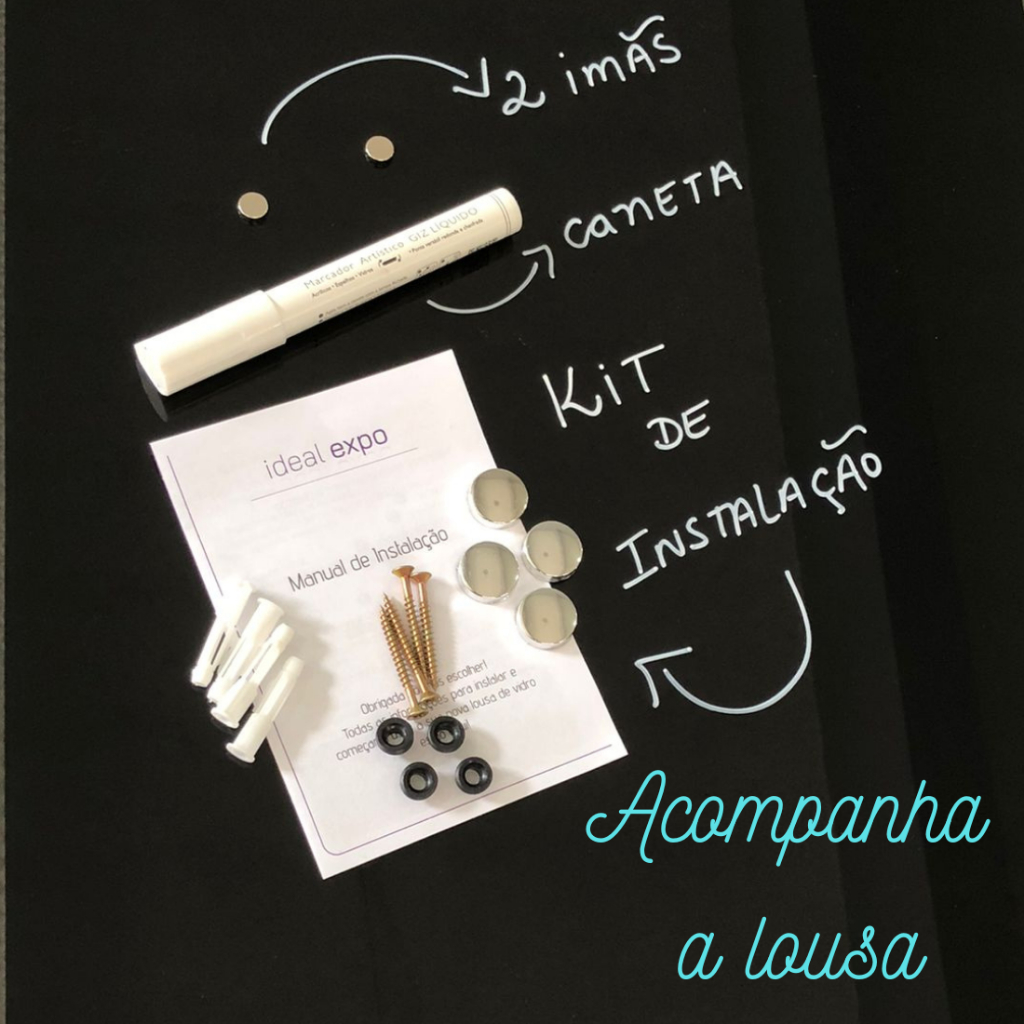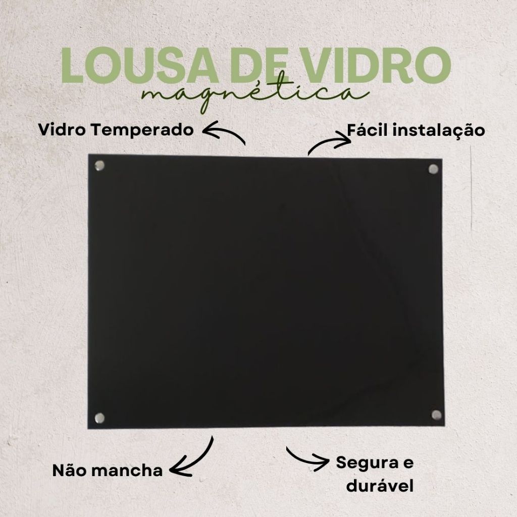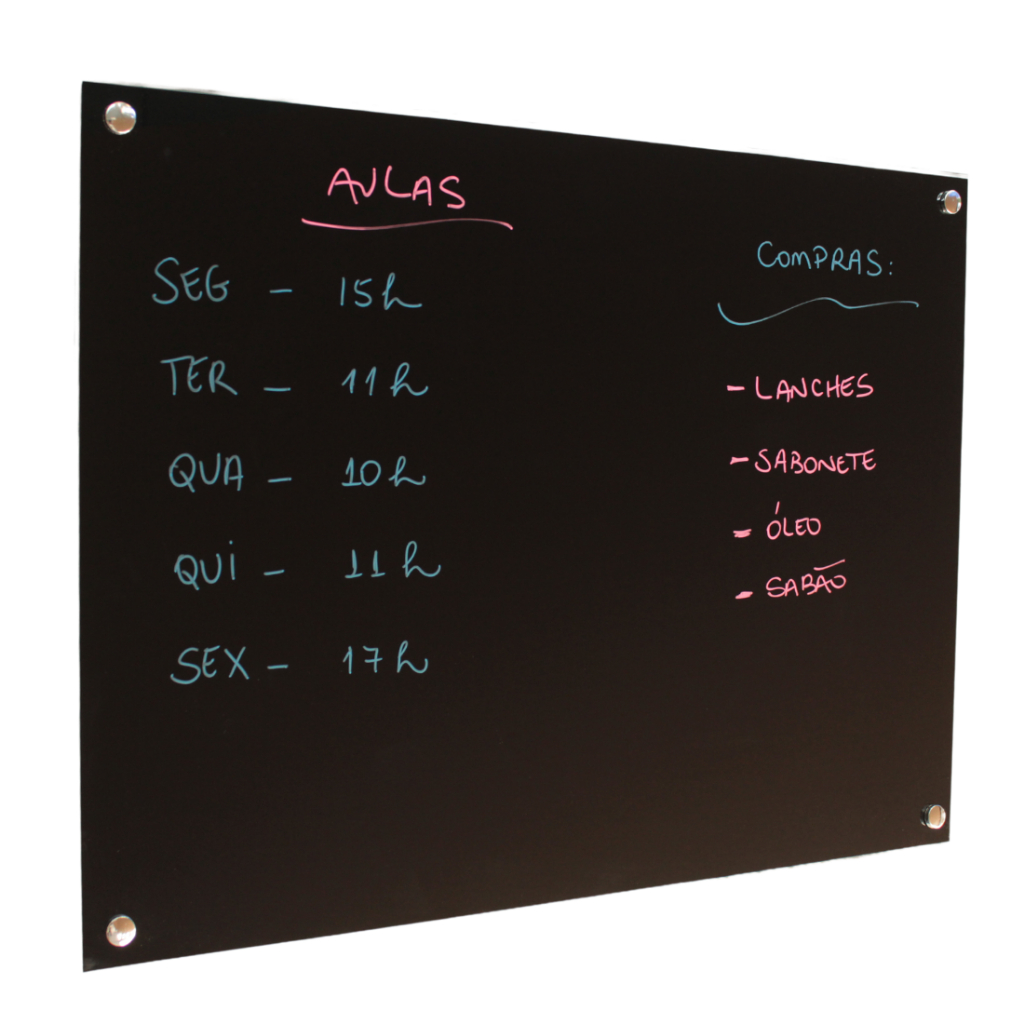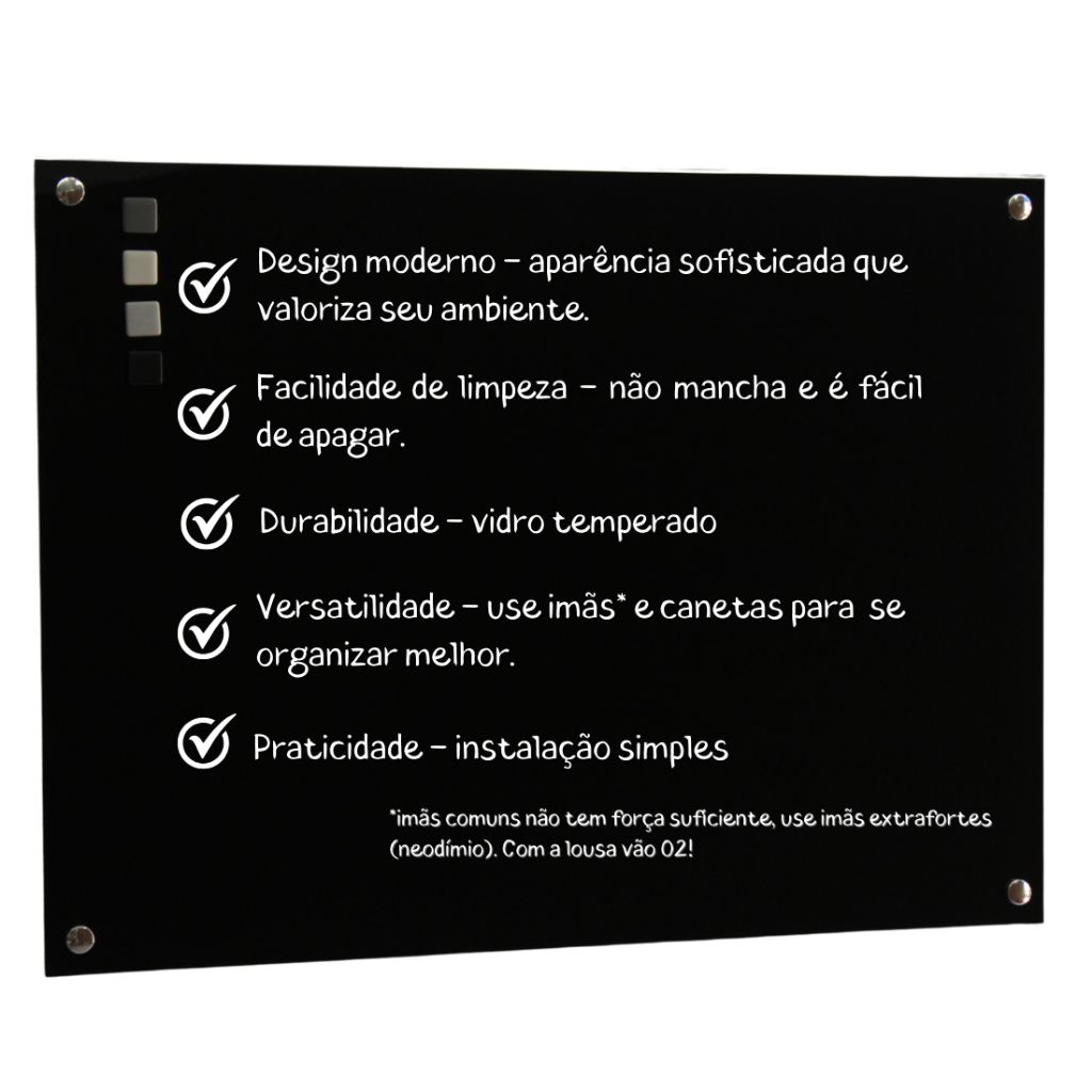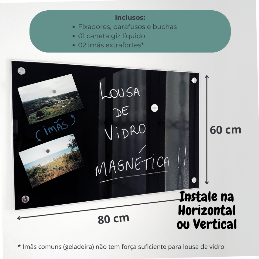 Lousa de vidro magnética preta, med. 80x60 cm com caneta e imãs quadro magnético
