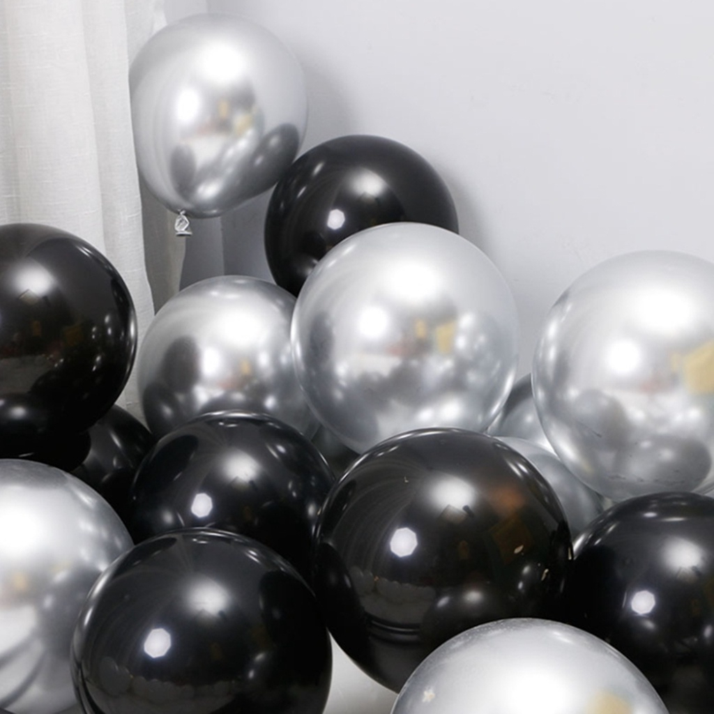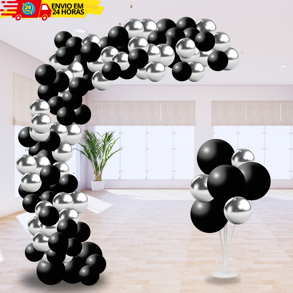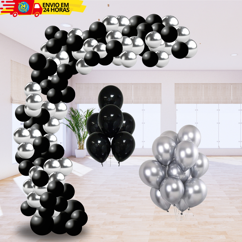 Kit 75 Balões Latex Preto + Prata Cromado Metalizado Para Festas e Aniversário