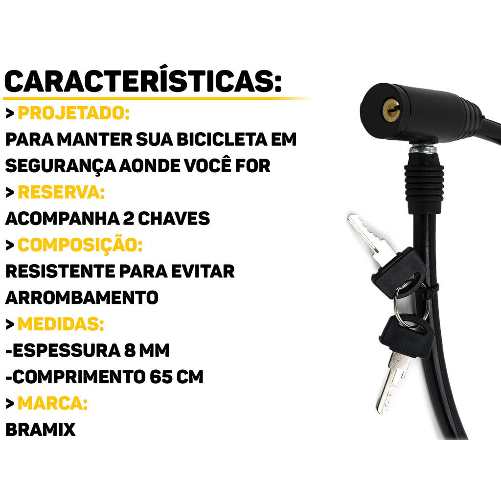 Trava De Segurança Anti Furto Cadeado Para Bicicleta Com Chave 8mm x 65cm Bramix