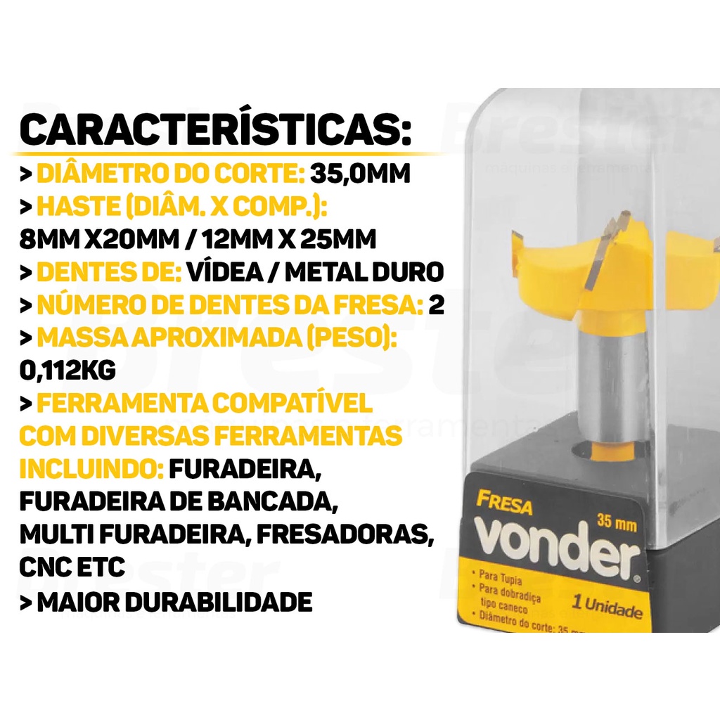 Fresa P/ Dobradiça Formato Caneco 35mm 2 Dentes Vonder 5314100035