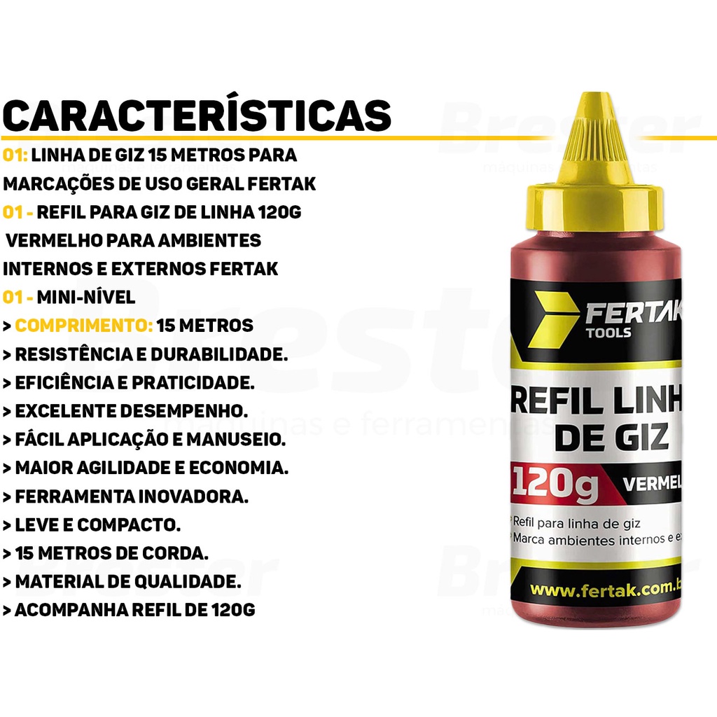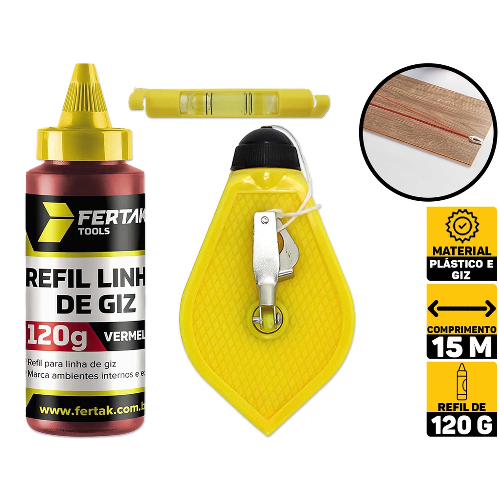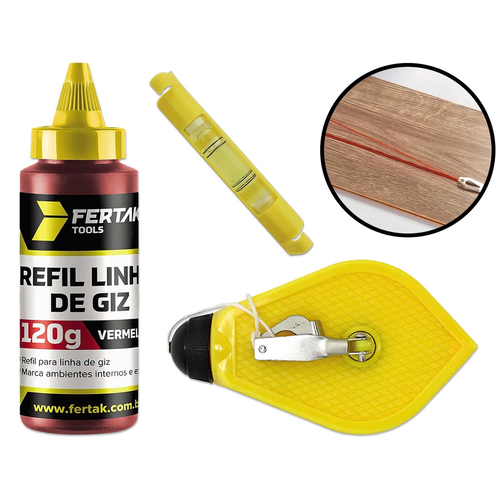 Kit Giz De Linha 15 Metros Pedreiro Gesseiro Marcação Gesso Nível Com Refil Fertak 6944