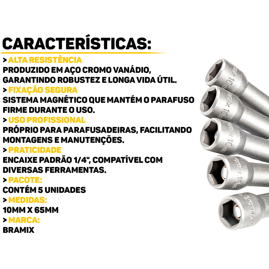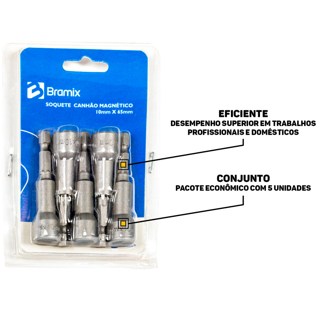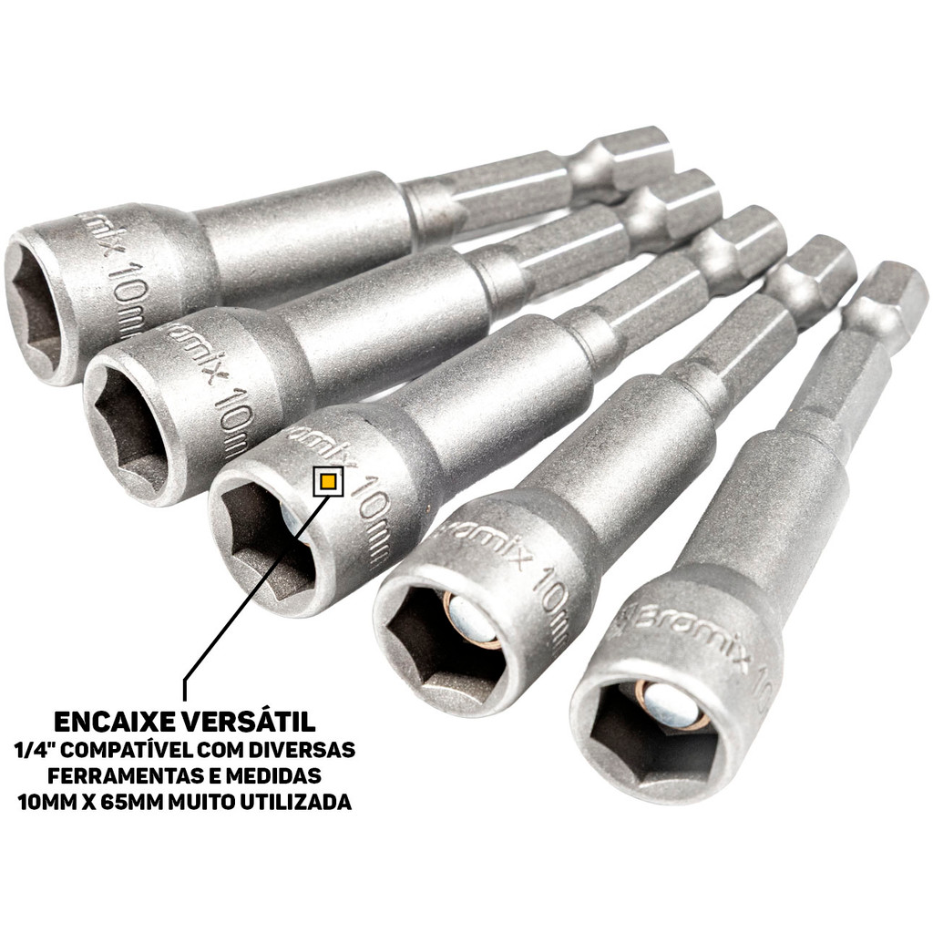 Soquete Canhão Magnético Bramix 10mm x 65mm Kit 5 Peças P/ Ferramentas Parafusadeira Construção