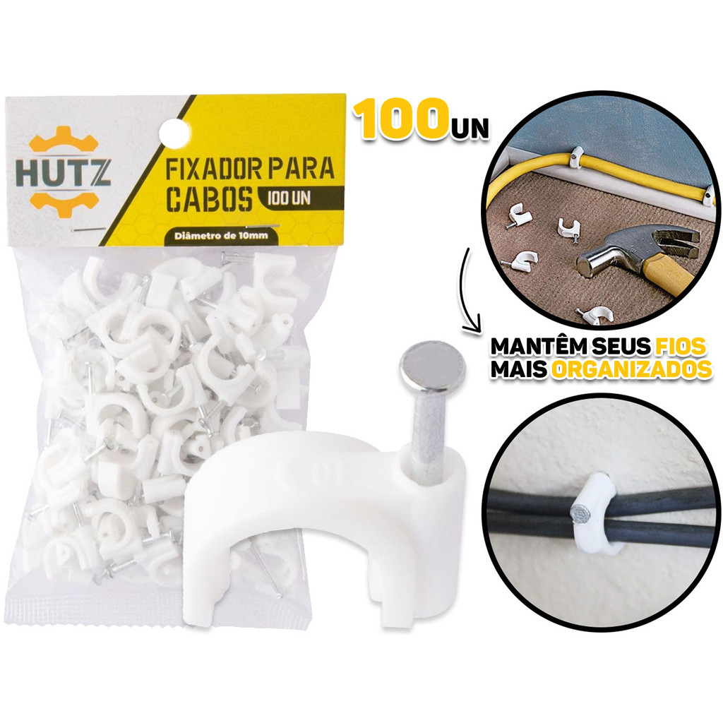 Organizador Fixador Prendedor Para Fios E Cabos 10mm Plástico E Ferro 100 Peças Hutz