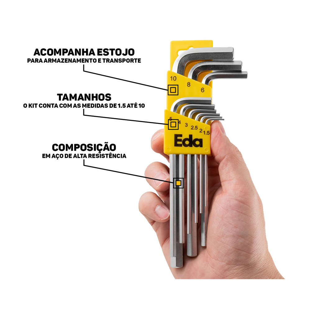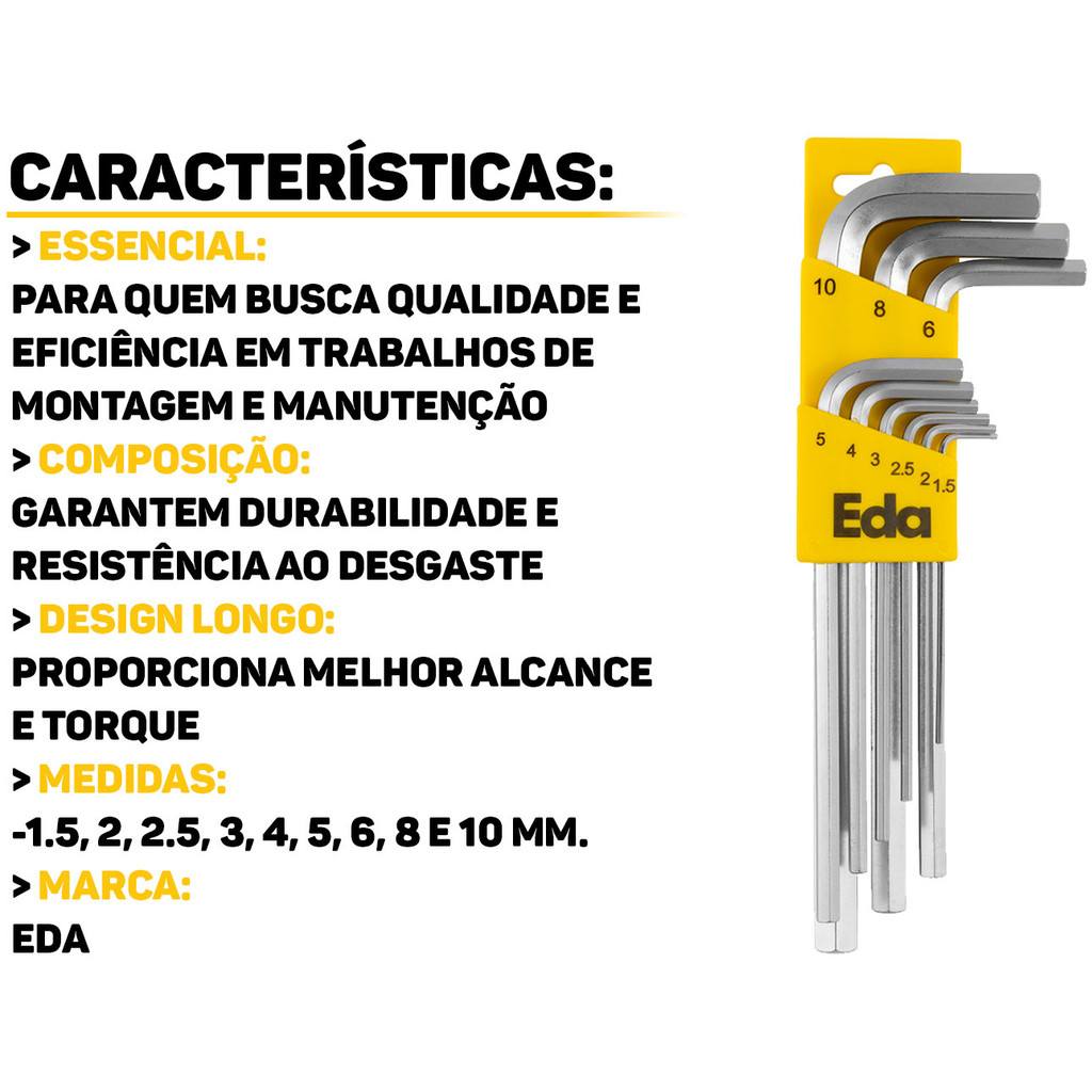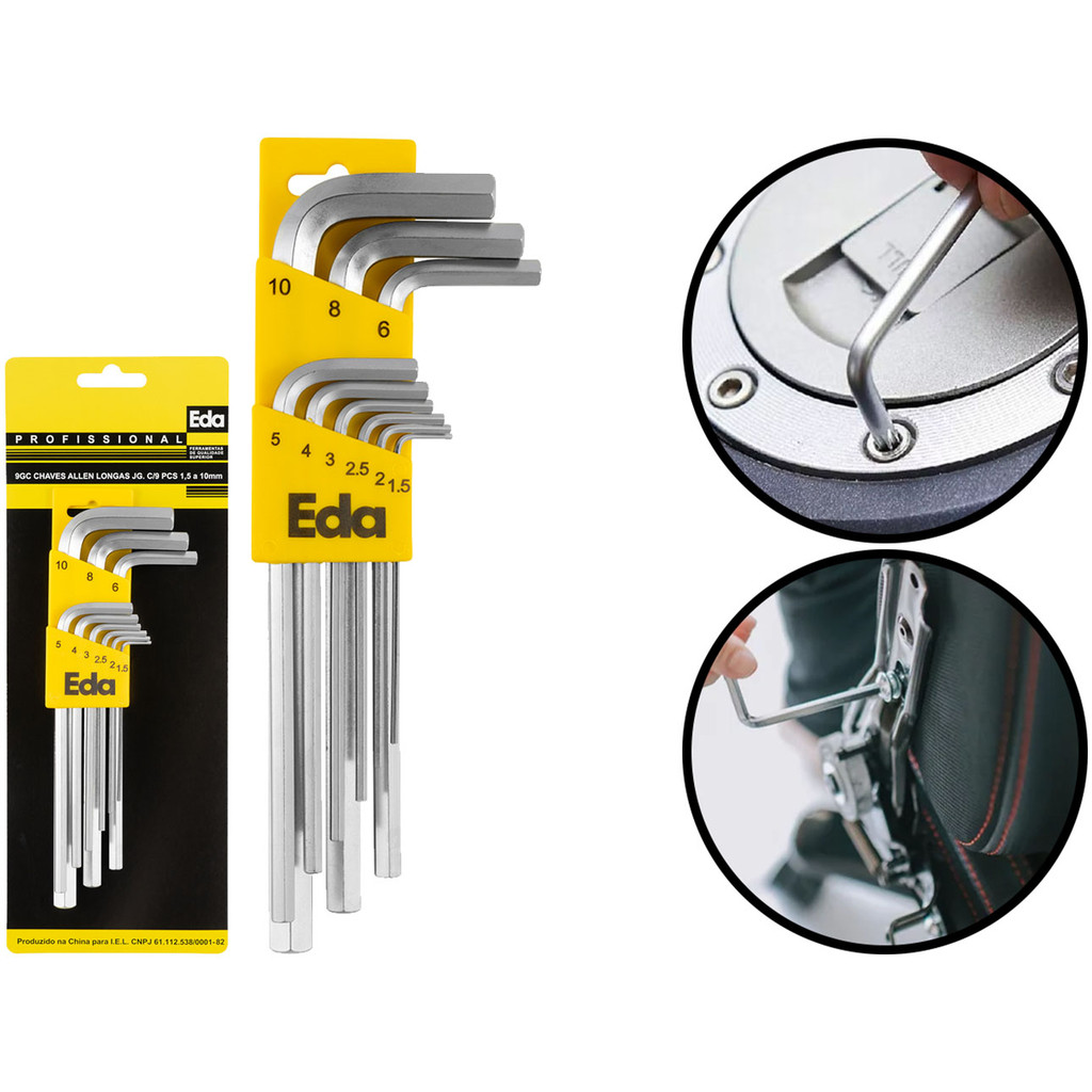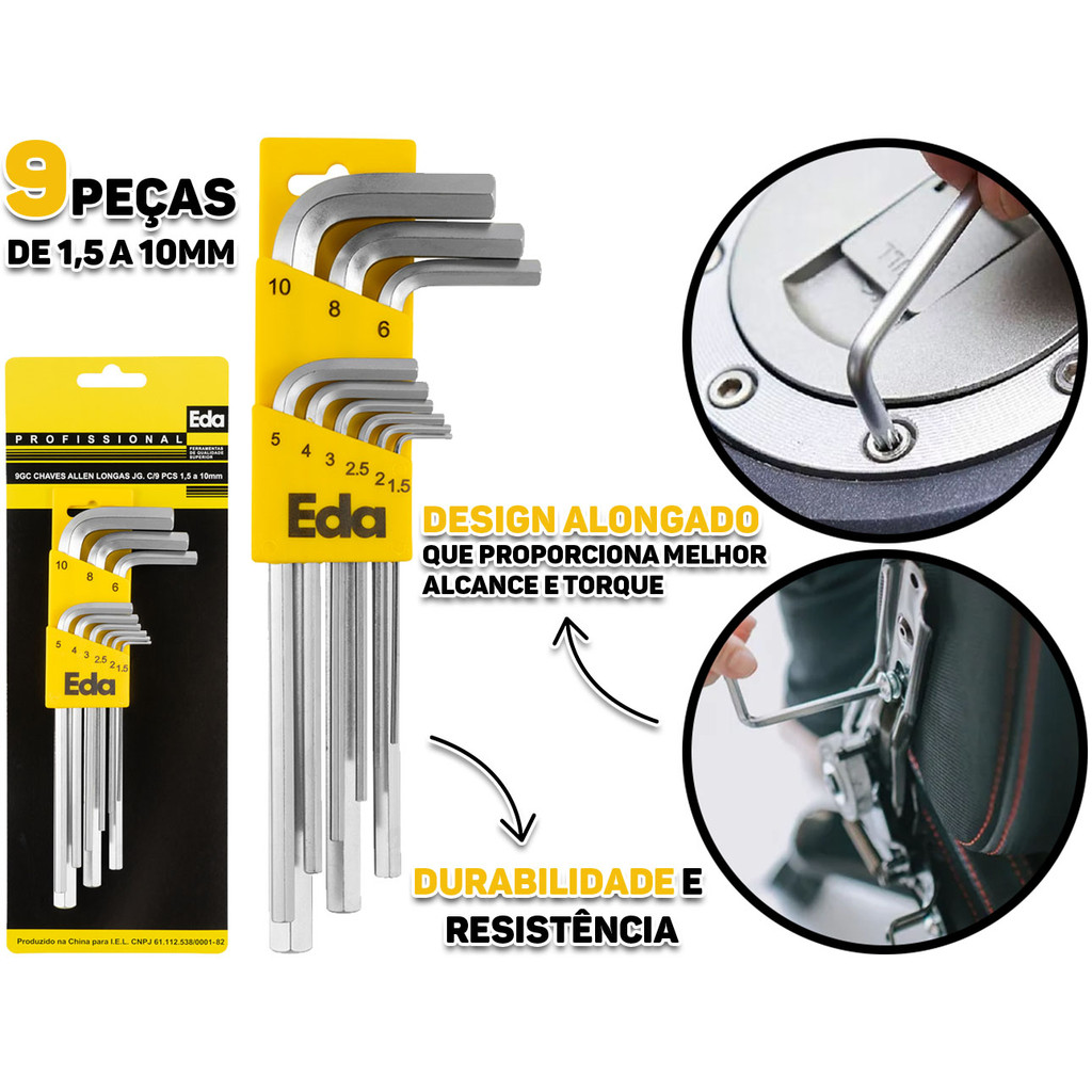 Jogo De Chaves Allen Longas 9 Peças Hexagonal Aço Cromo 1,5mm a 10mm Profissional Eda