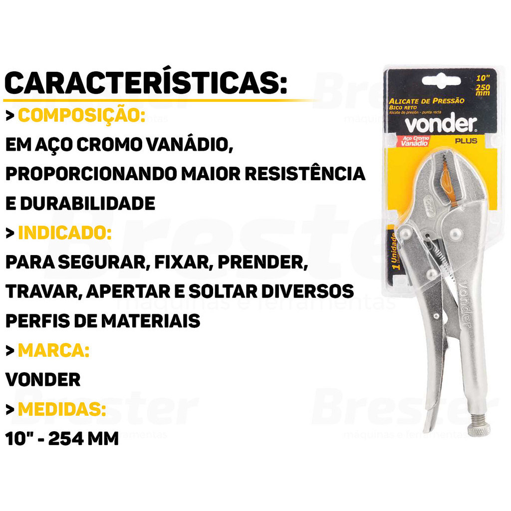 Alicate De Pressão Reto Aço Cromo Vanádio Acabamento Cromado 10 Polegadas Fixa Prende Trava Aperta