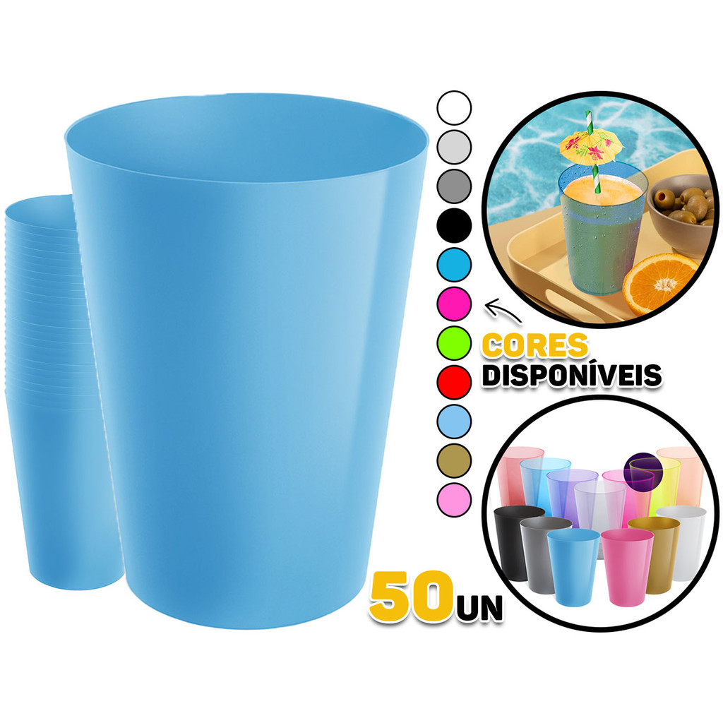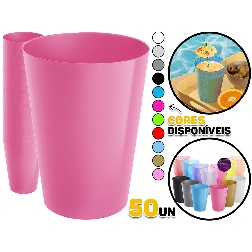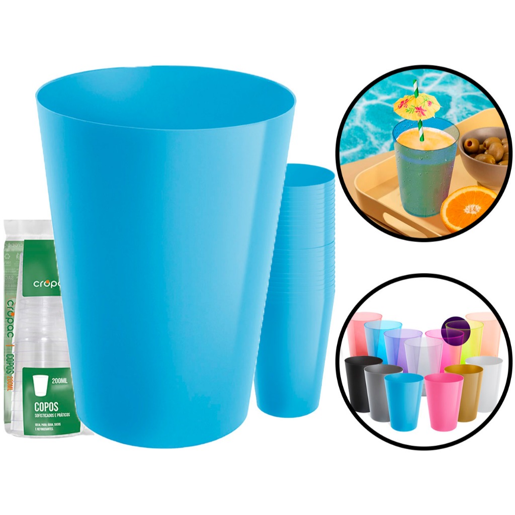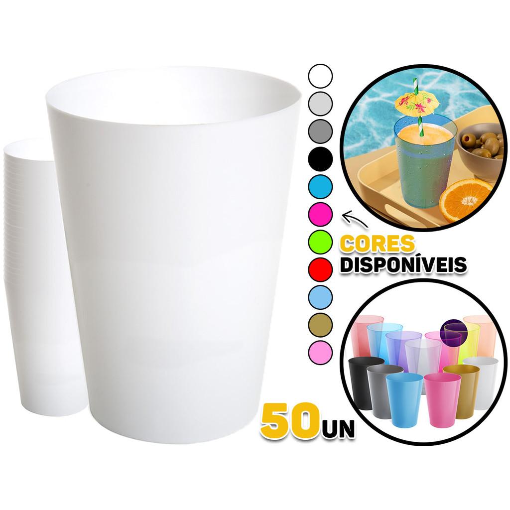Kit 50 Copo Copos 200ml Plástico Acrílico Lavável Resistente Bebidas Drinks Suco Refri Coloridos