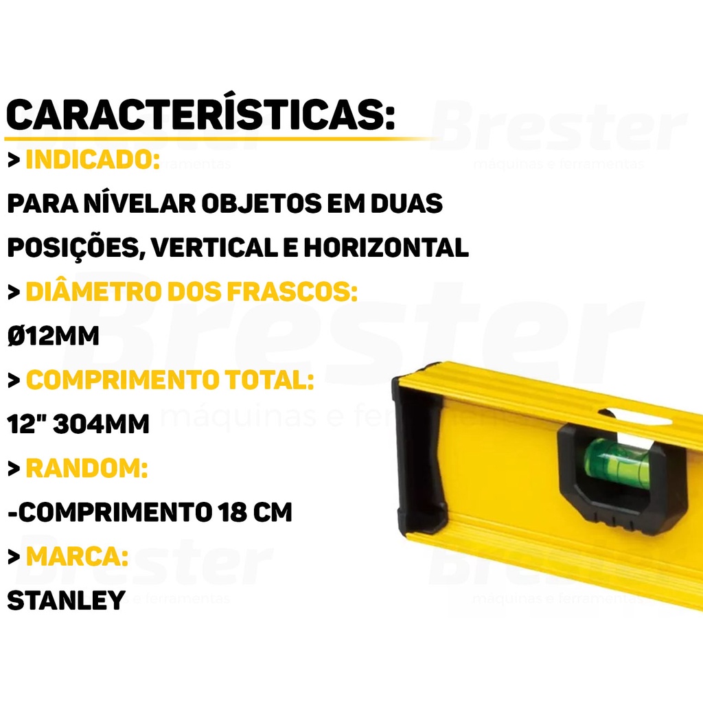 Nível de Alumínio Profissional 2 Bolhas 30cm Régua de Prumo Para Pedreiro Carpintaria Medição Stanley