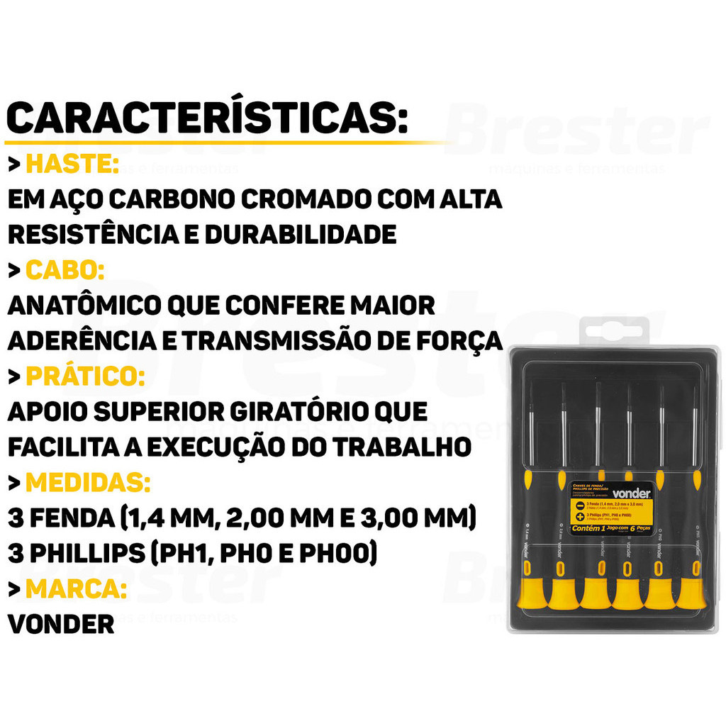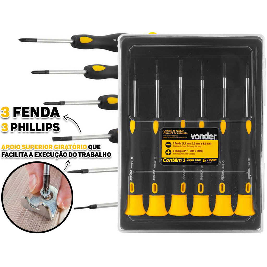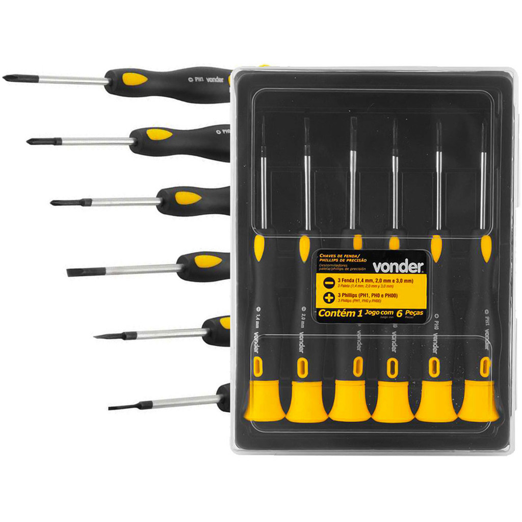Chave De Fenda E Phillips De Precisão Haste Em Aço Cromado Para Relojoarias Eletrônicos 6 Peças Vonder