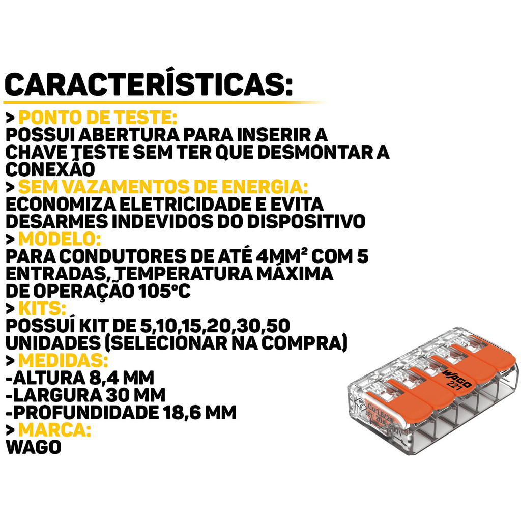 Kit 3, 5, 10 e 20 Conector Elétrico 221-415 Emenda Wago 5 Vias 32A Original 4mm² e 6mm² Fio Chuveiro Tomada