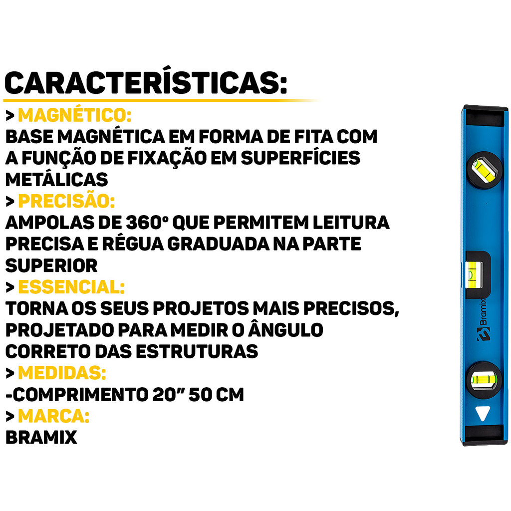 Nível De Alumínio 50cm Reforçado Com Base Magnética Três Bolhas Profissional 20 Polegadas Bramix
