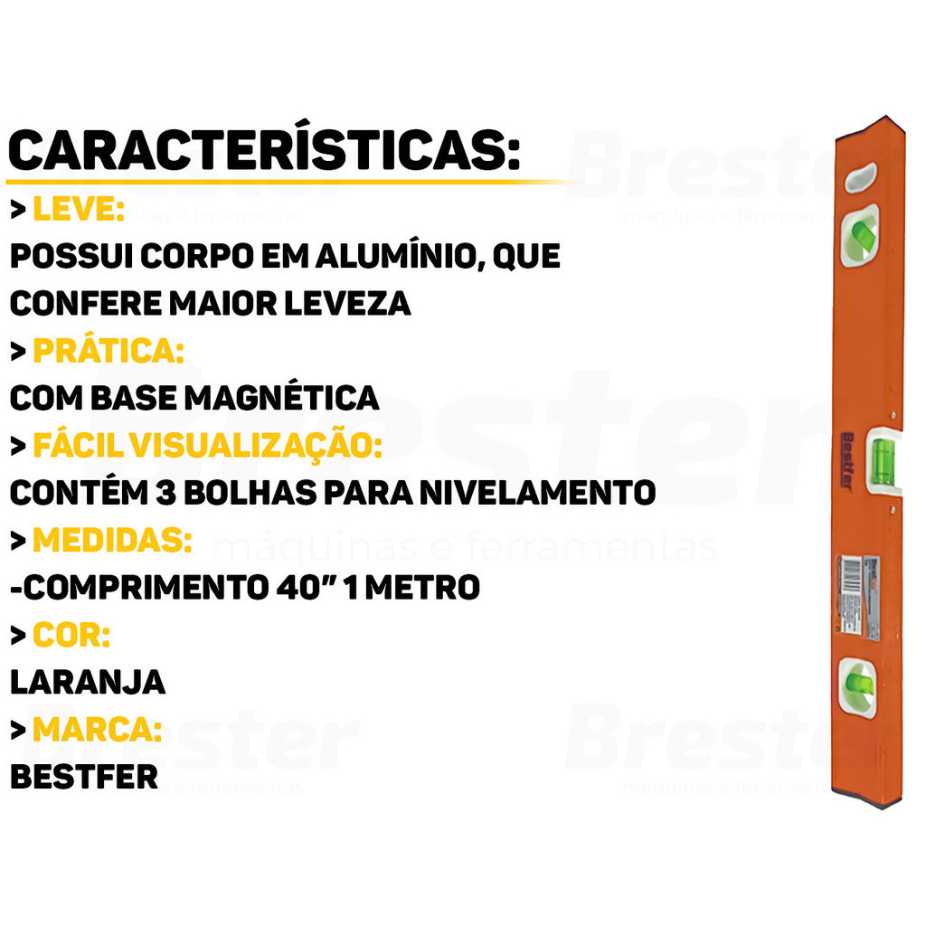 Nível Alumínio Imantado 1 Metro C/ Base Magnética Para Pedreiro Carpintaria Medição Bestfer