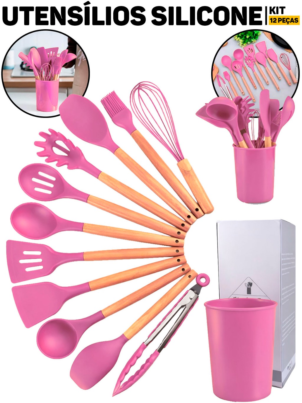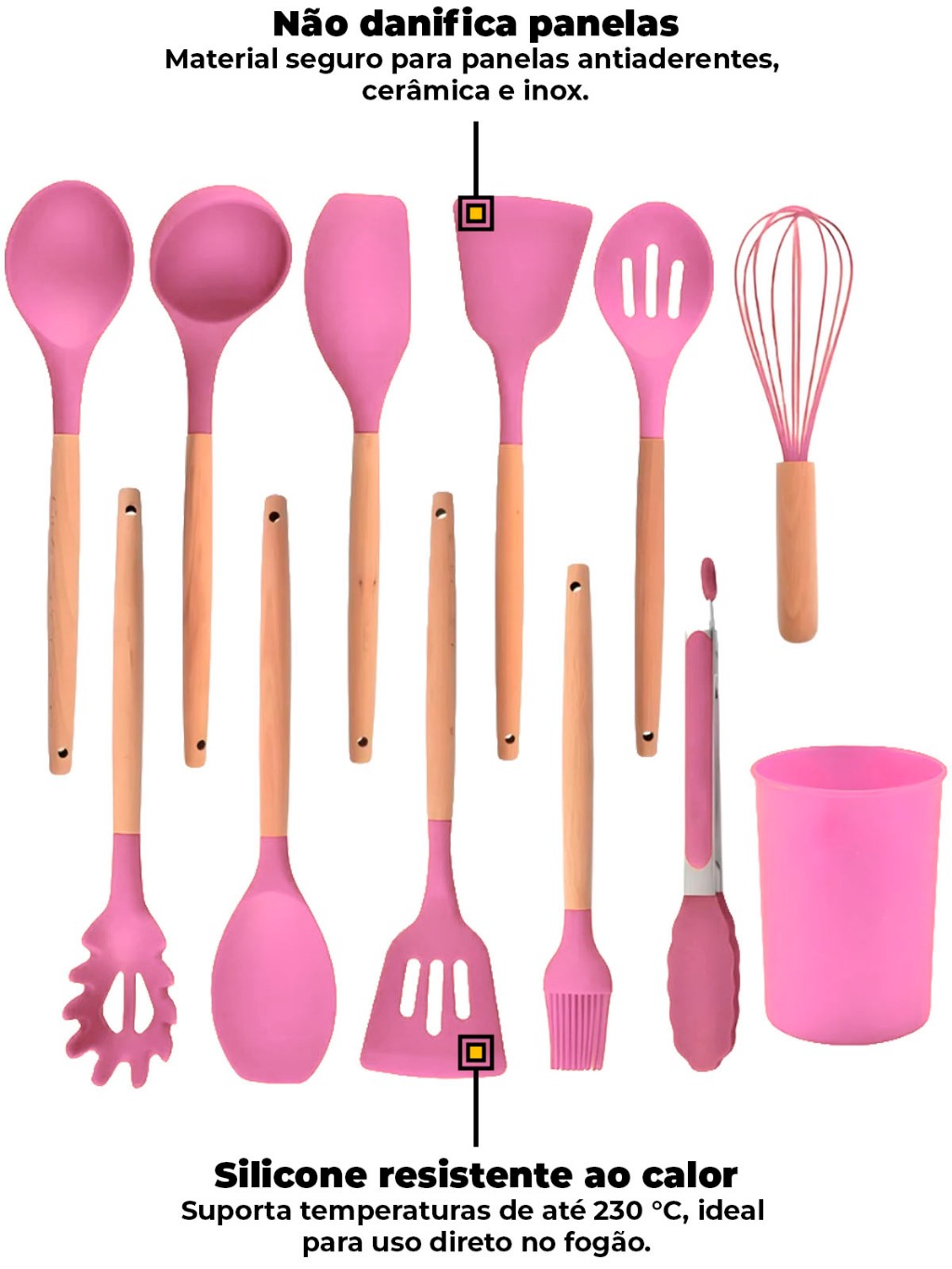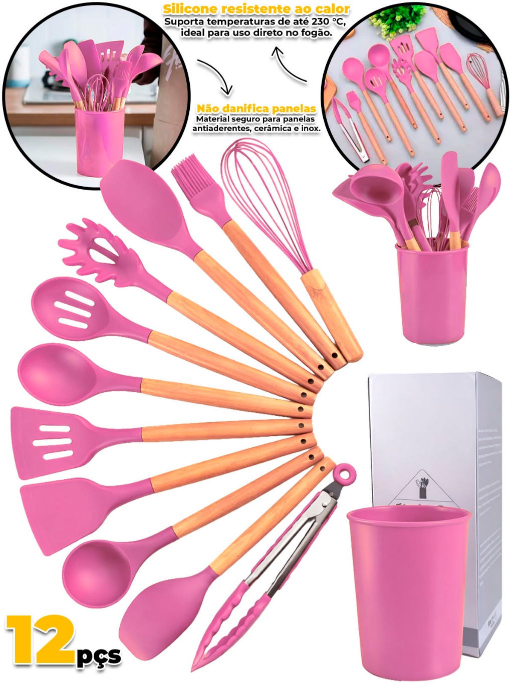 Kit Jogo Utensílios De Cozinha Silicone 12 Peças Cabo Madeira Panelas Antiaderente Cozinha