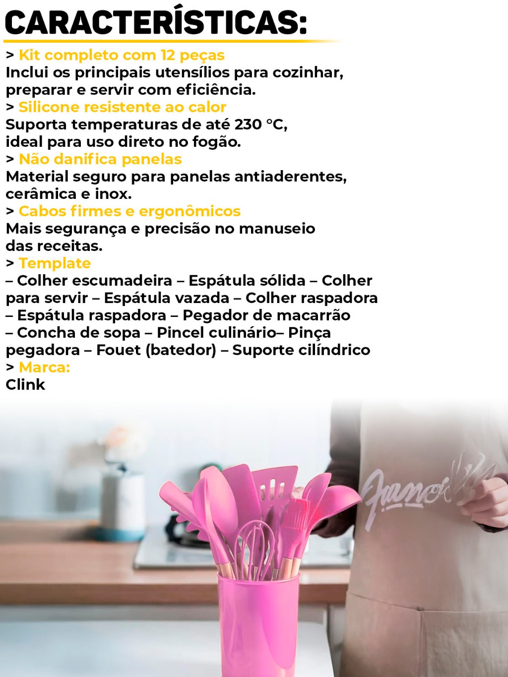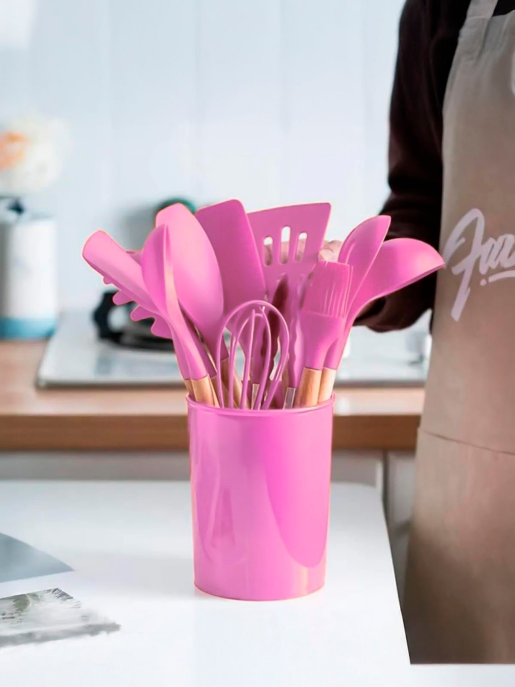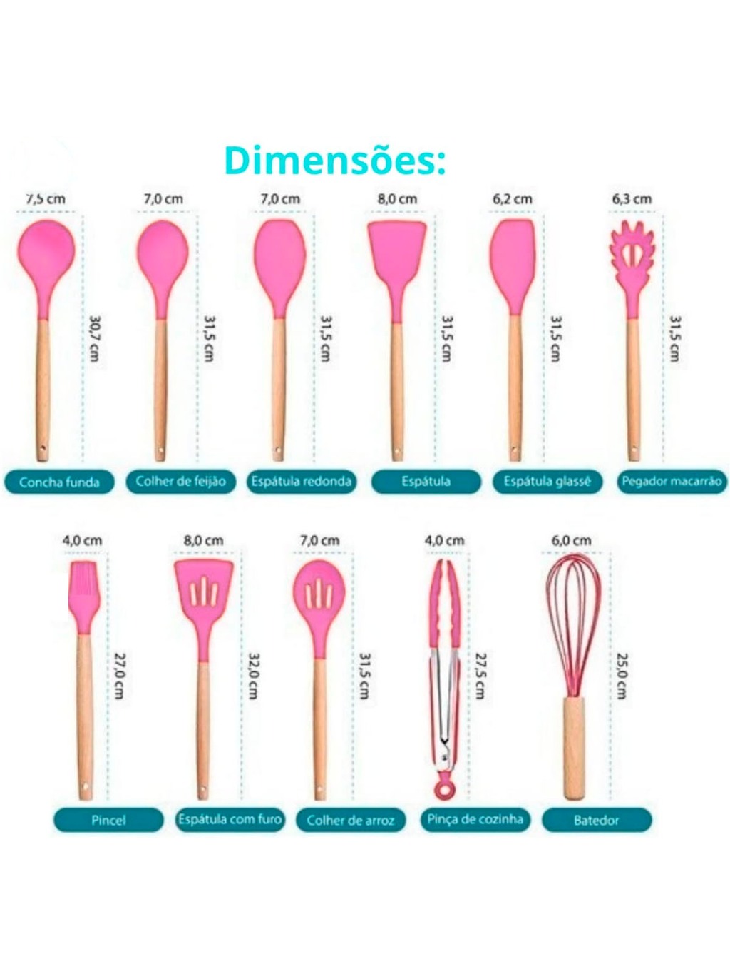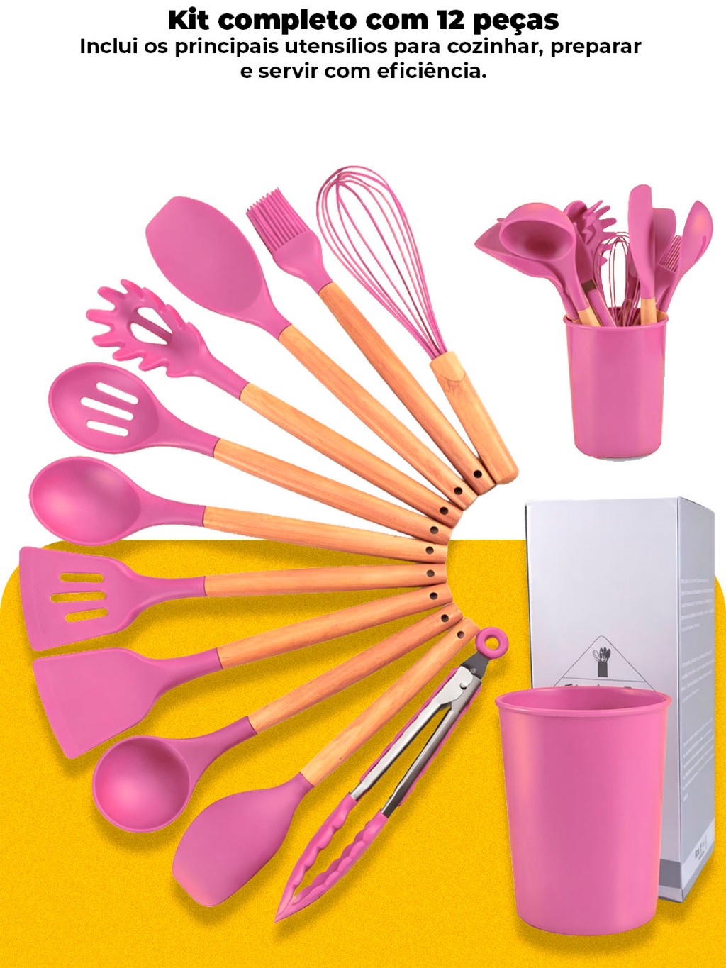 Kit Jogo Utensílios De Cozinha Silicone 12 Peças Cabo Madeira Panelas Antiaderente Cozinha