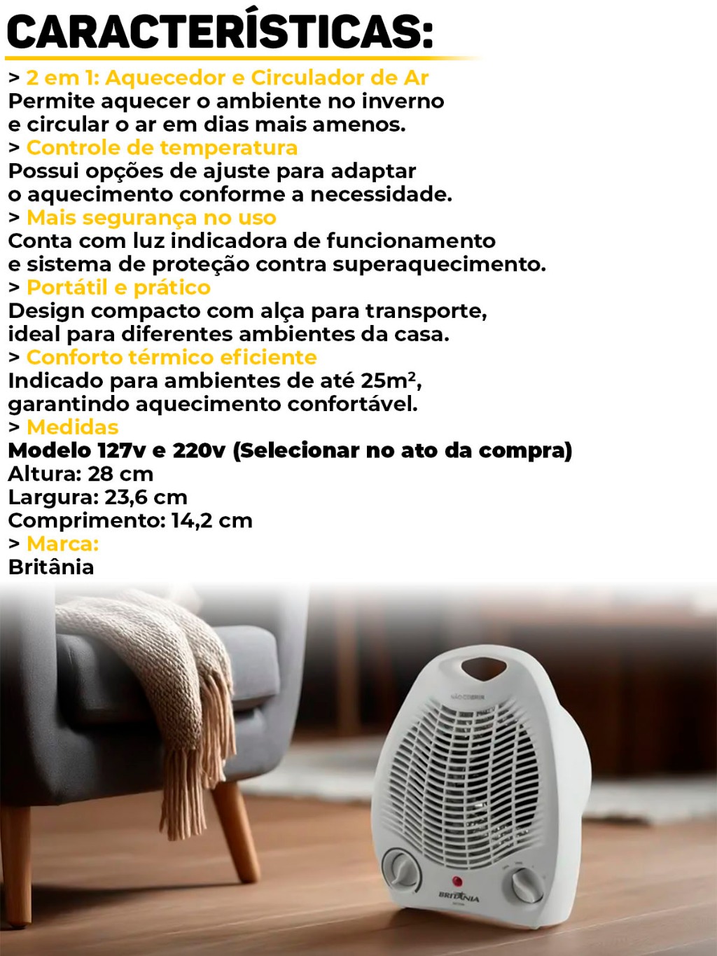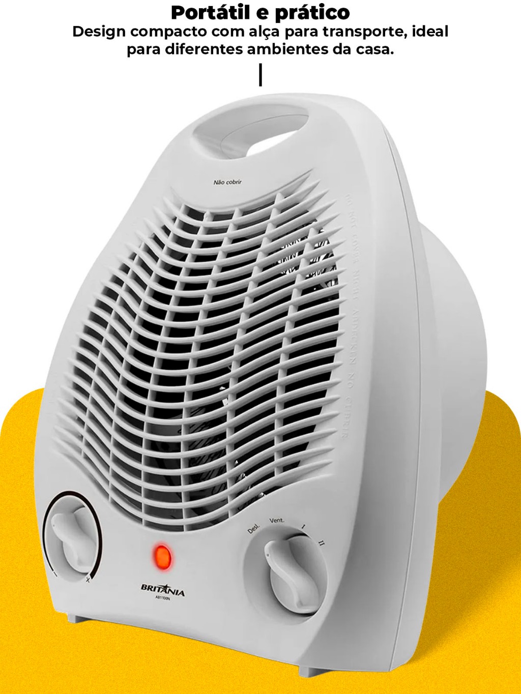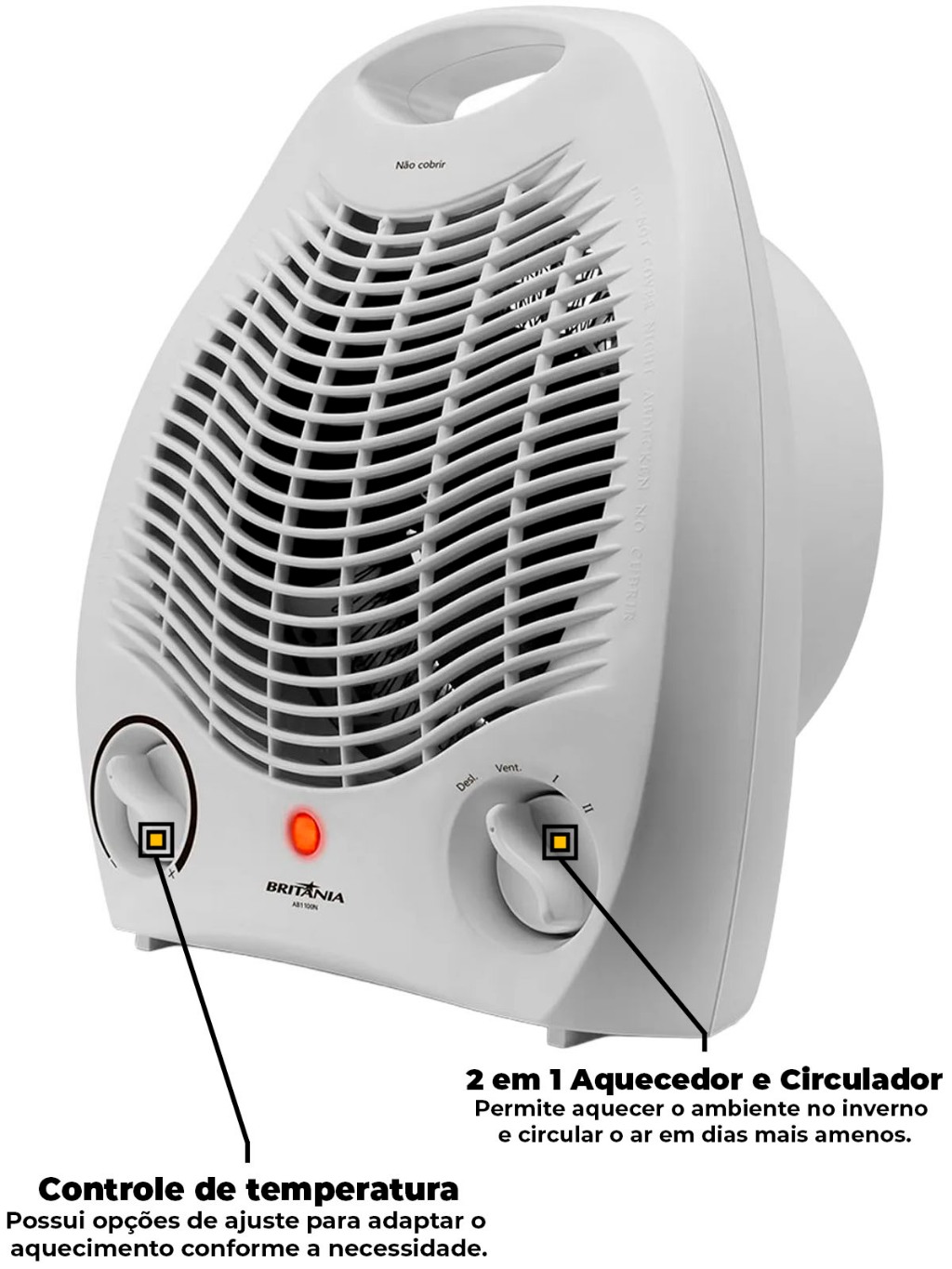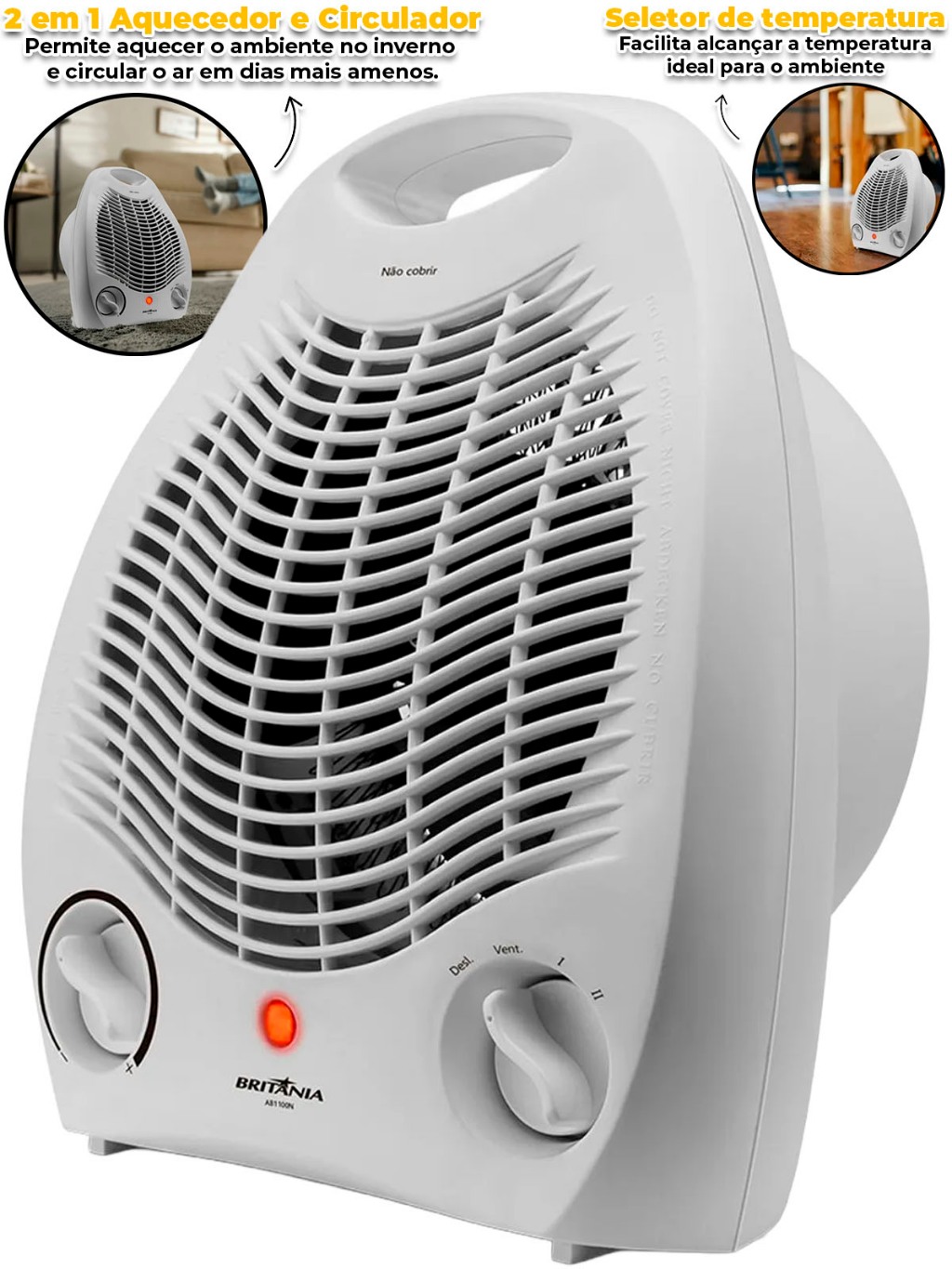 Aquecedor Britânia 1500W AB1100N 3 Níveis Aquecimento Ventilador Portátil P/ Quarto Sala Escritório