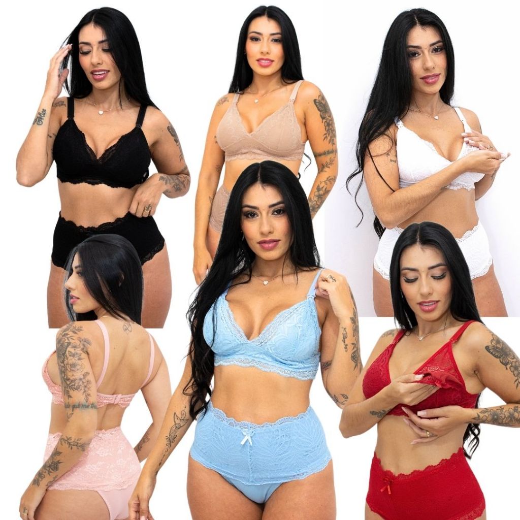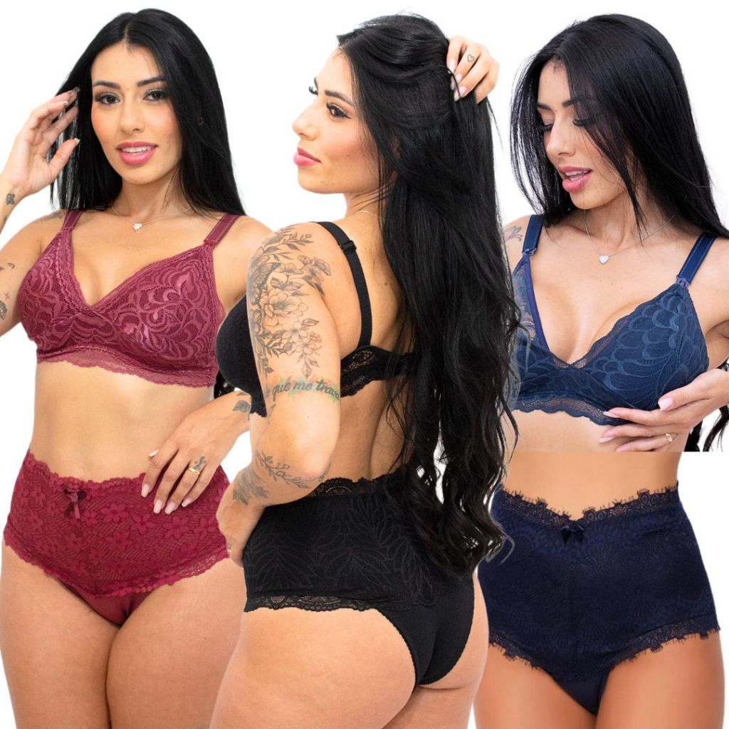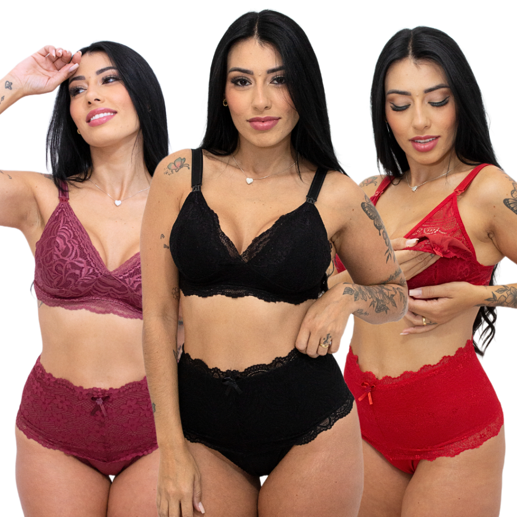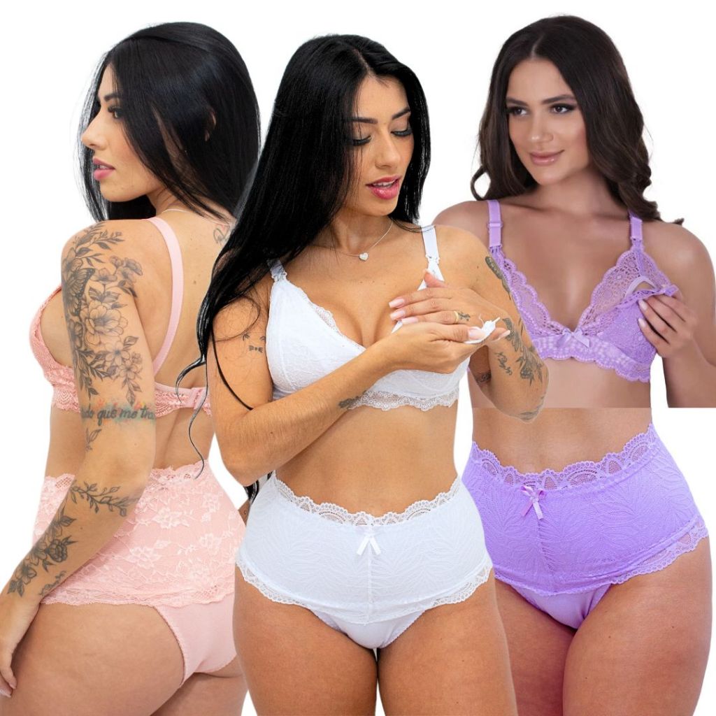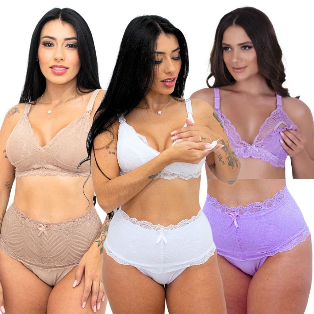 Kit 3 Conjuntos Amamentação Sutiã E Calcinha Gestante Pós Parto Fácil de Amamentar