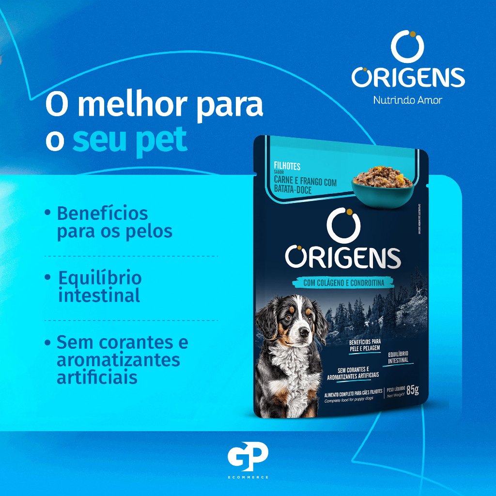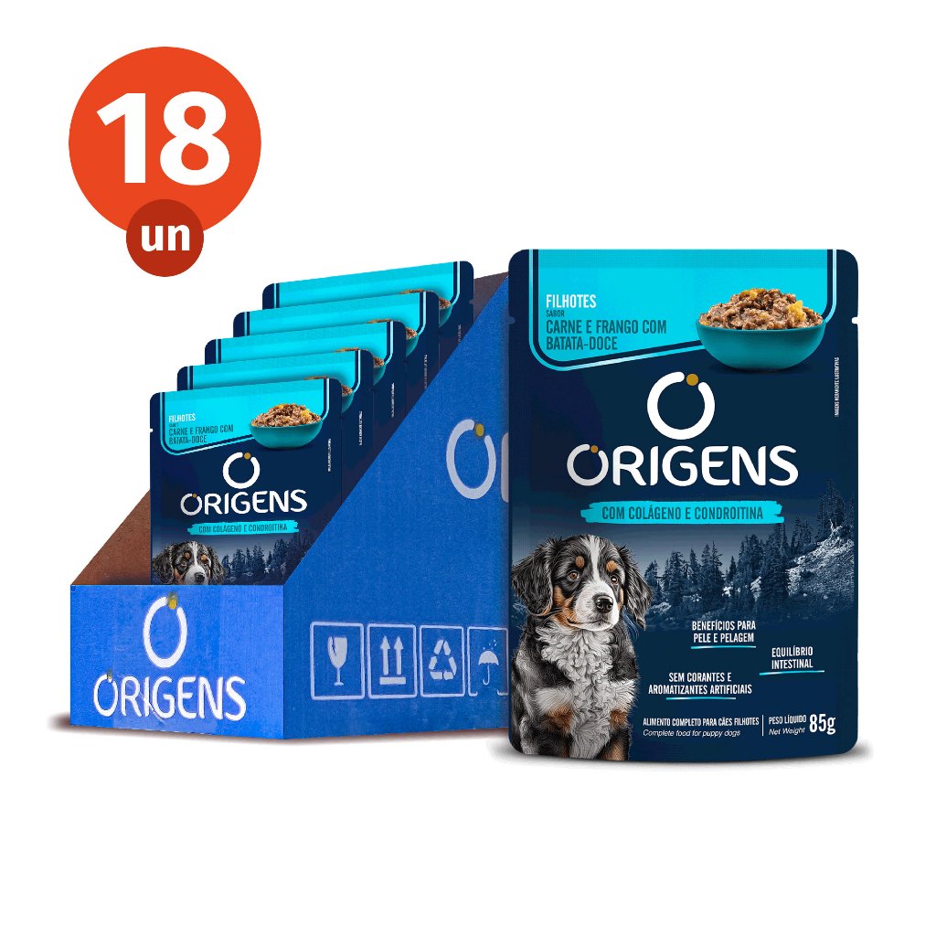 Kit CAIXA FECHADA 18 Sachê Origens Cães Filhotes Sabor Carne e Frango com Batata-Doce Premium Especial 85g Adimax