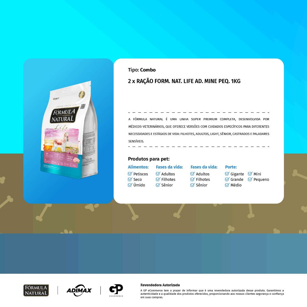Kit 2 Ração Fórmula Natural Life Cães Adultos Porte Mini e Pequeno 1kg Adimax Total de 2kg