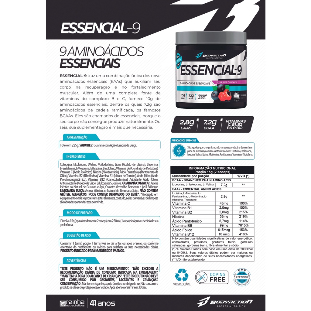 Essencial 9 - Eaa Aminoácidos Essenciais 225g - Bodyaction