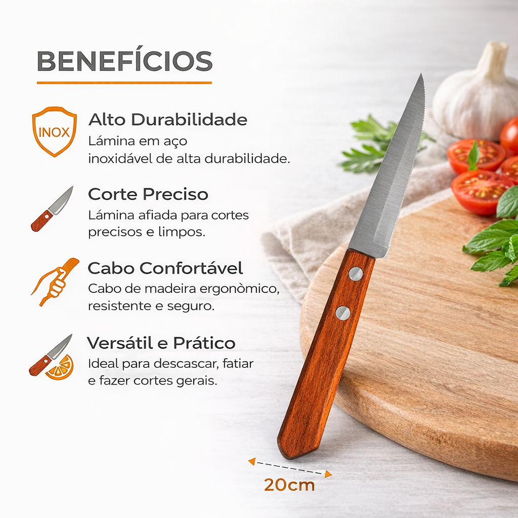 Kit 6 Faca de Cozinha Aço Inox Cabo Madeira Serrilhada Cozinha Comida Talher