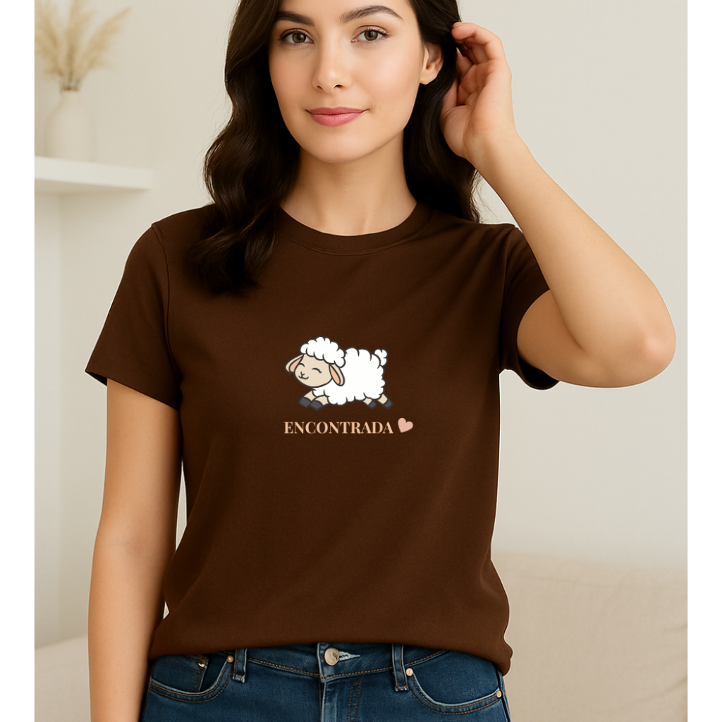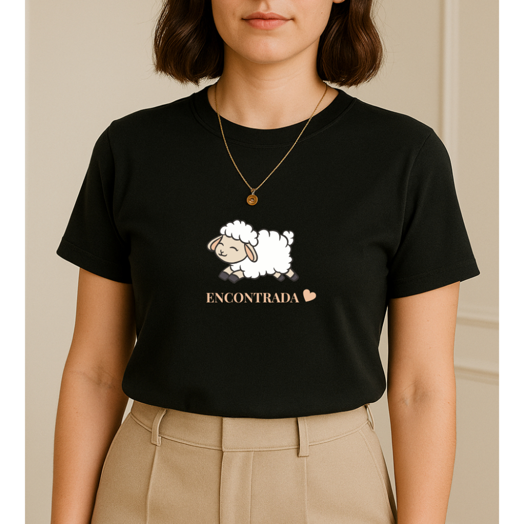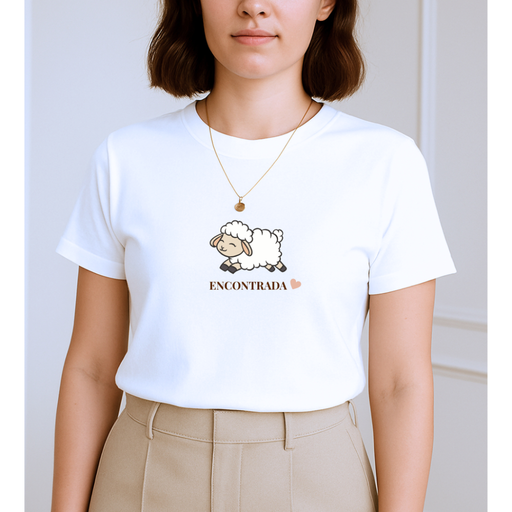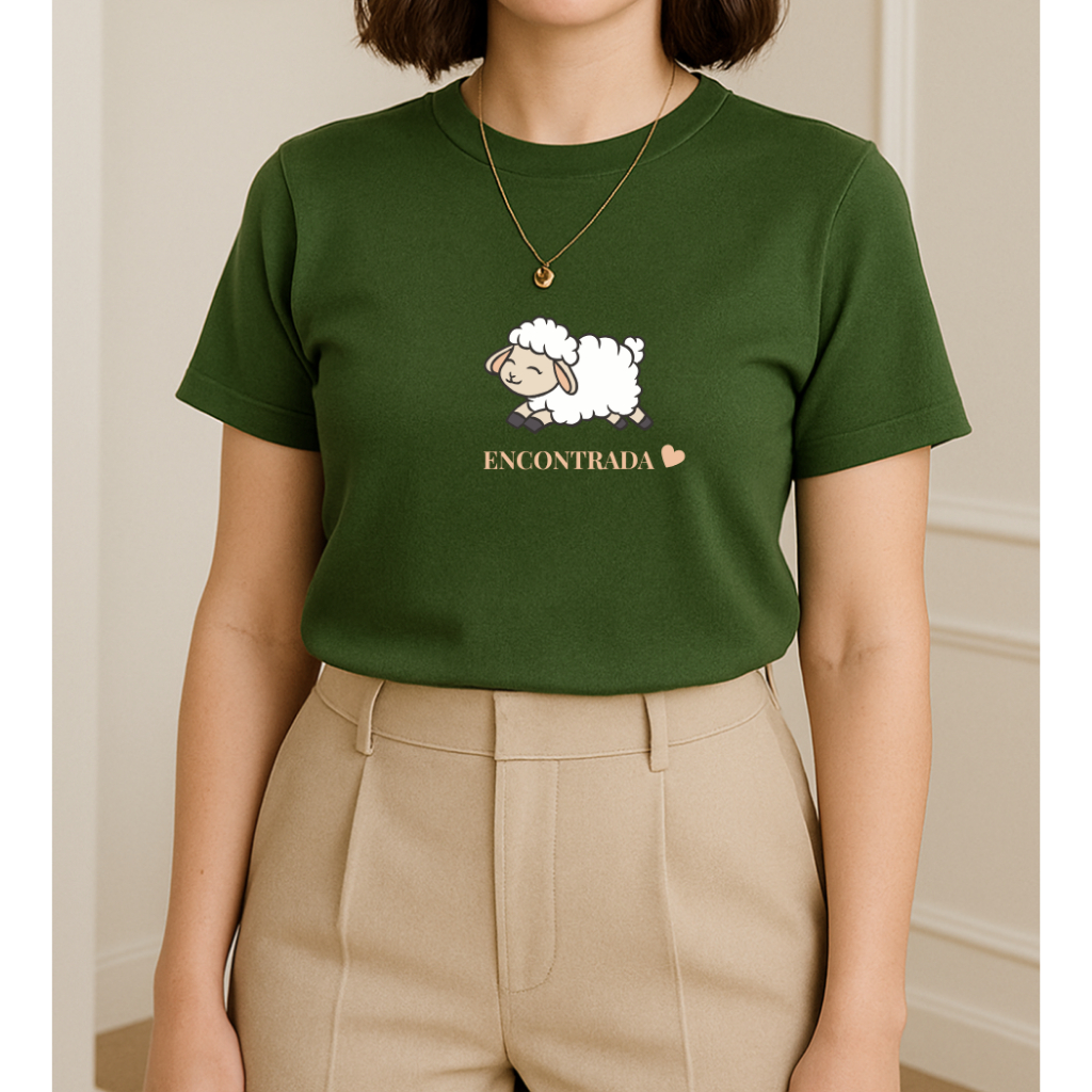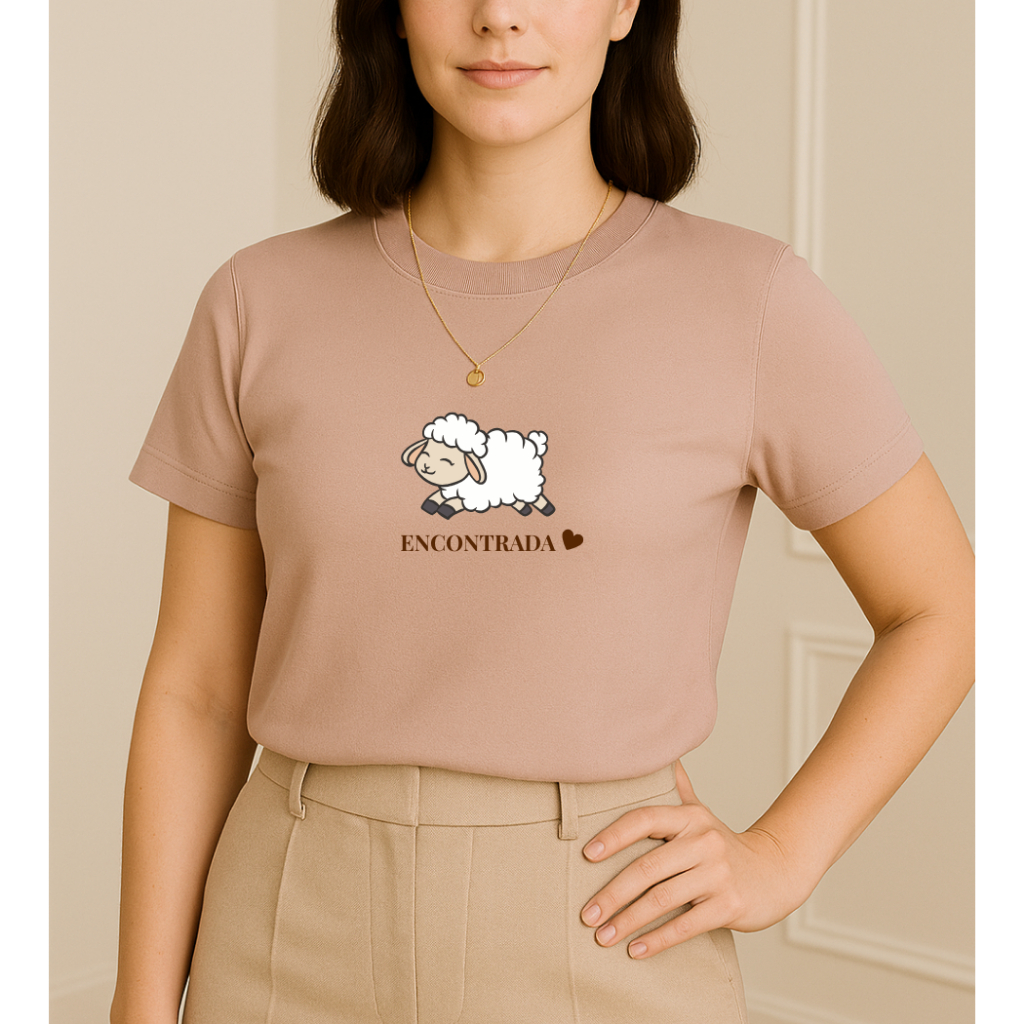 Blusa T shirt Feminina Cristã 100 % Algodão gola Ribana "ovelha encontrada"