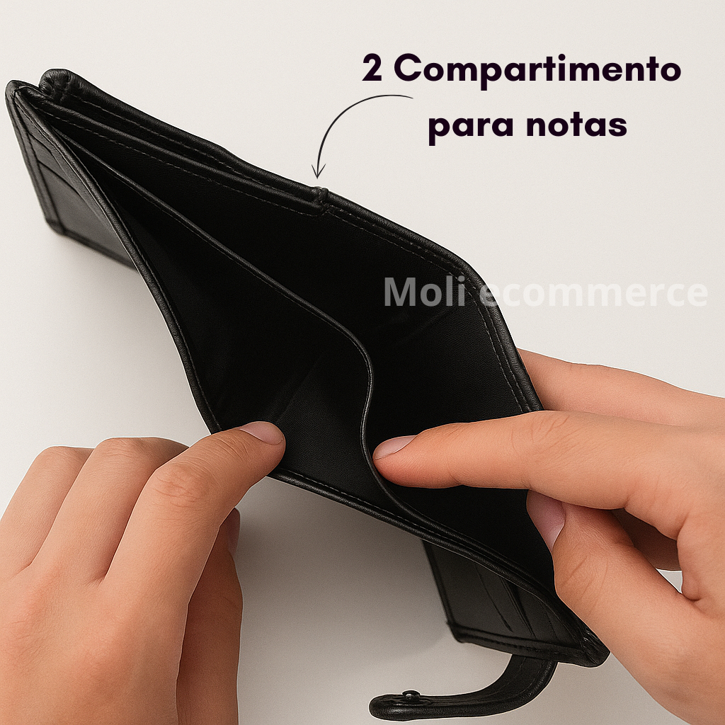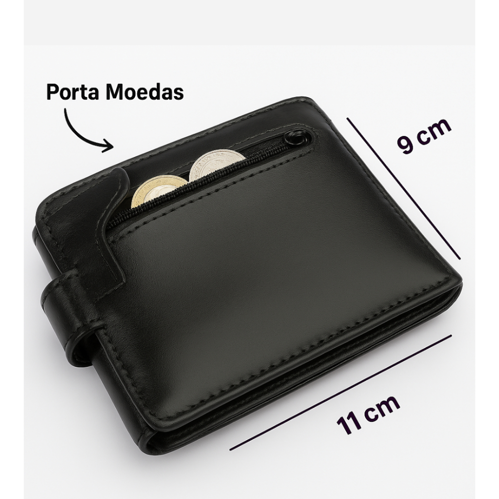 Carteira Masculina Couro Legitimo Com Fecho De Botão e Porta Moedas