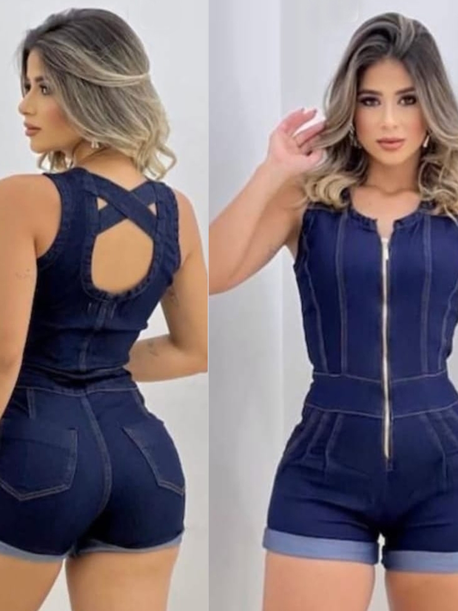 Macacão Feminino Jeans Curto Shorts Macaquito Com Strech