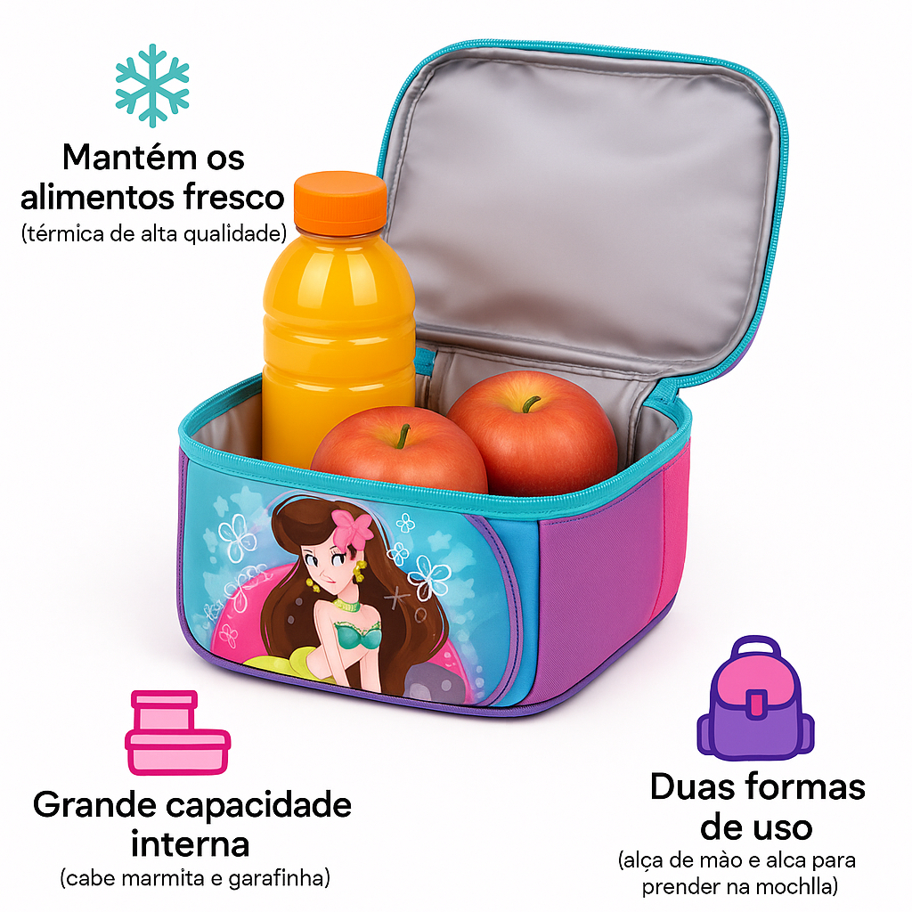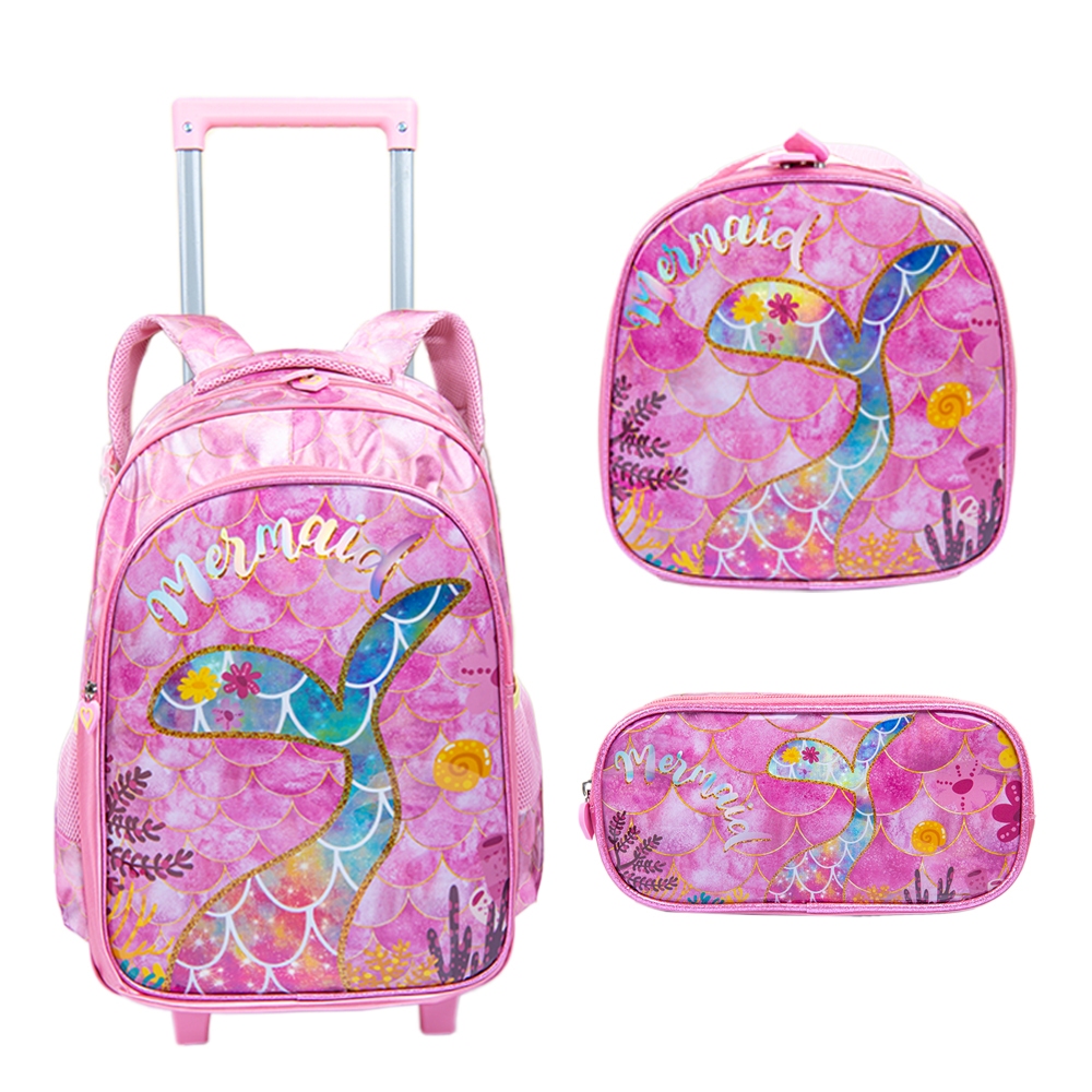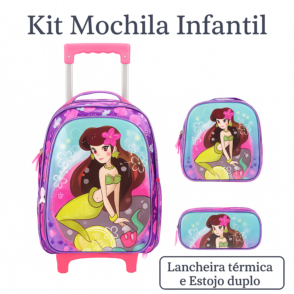 Kit Mochila Rodinha Escolar Infantil Menina Sereia Lancheira Térmica Estojo Impermeável