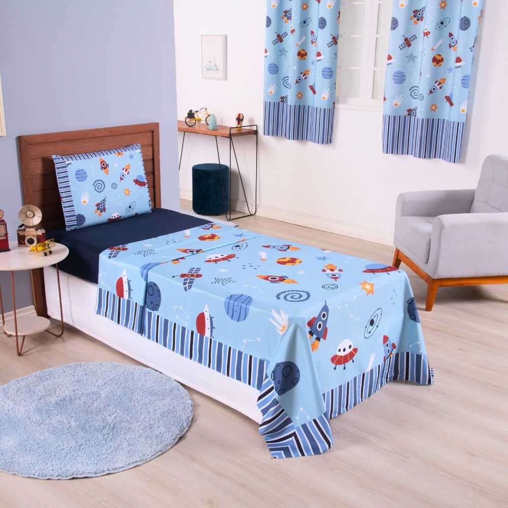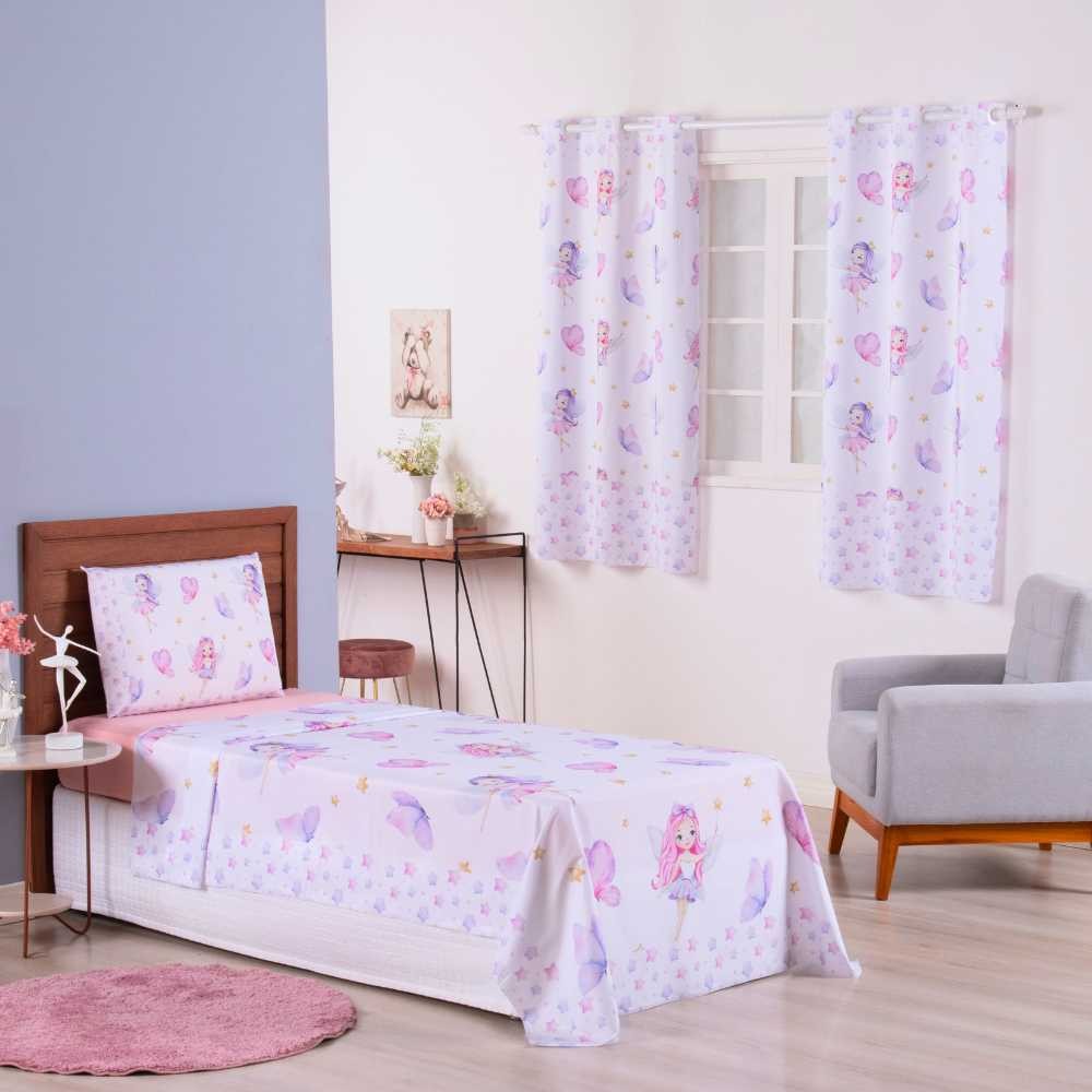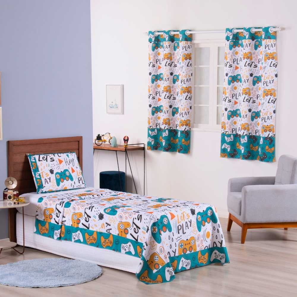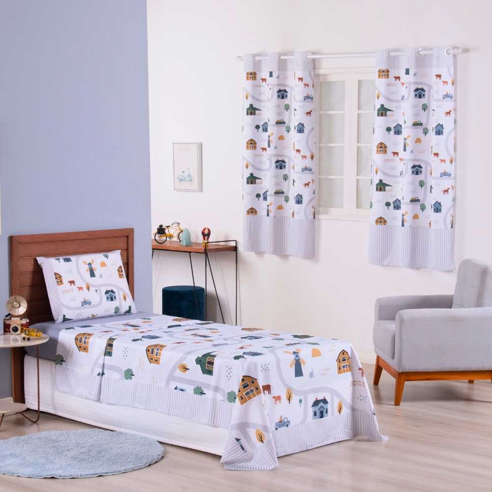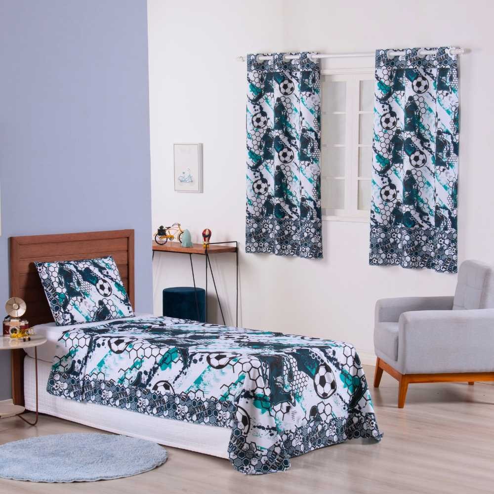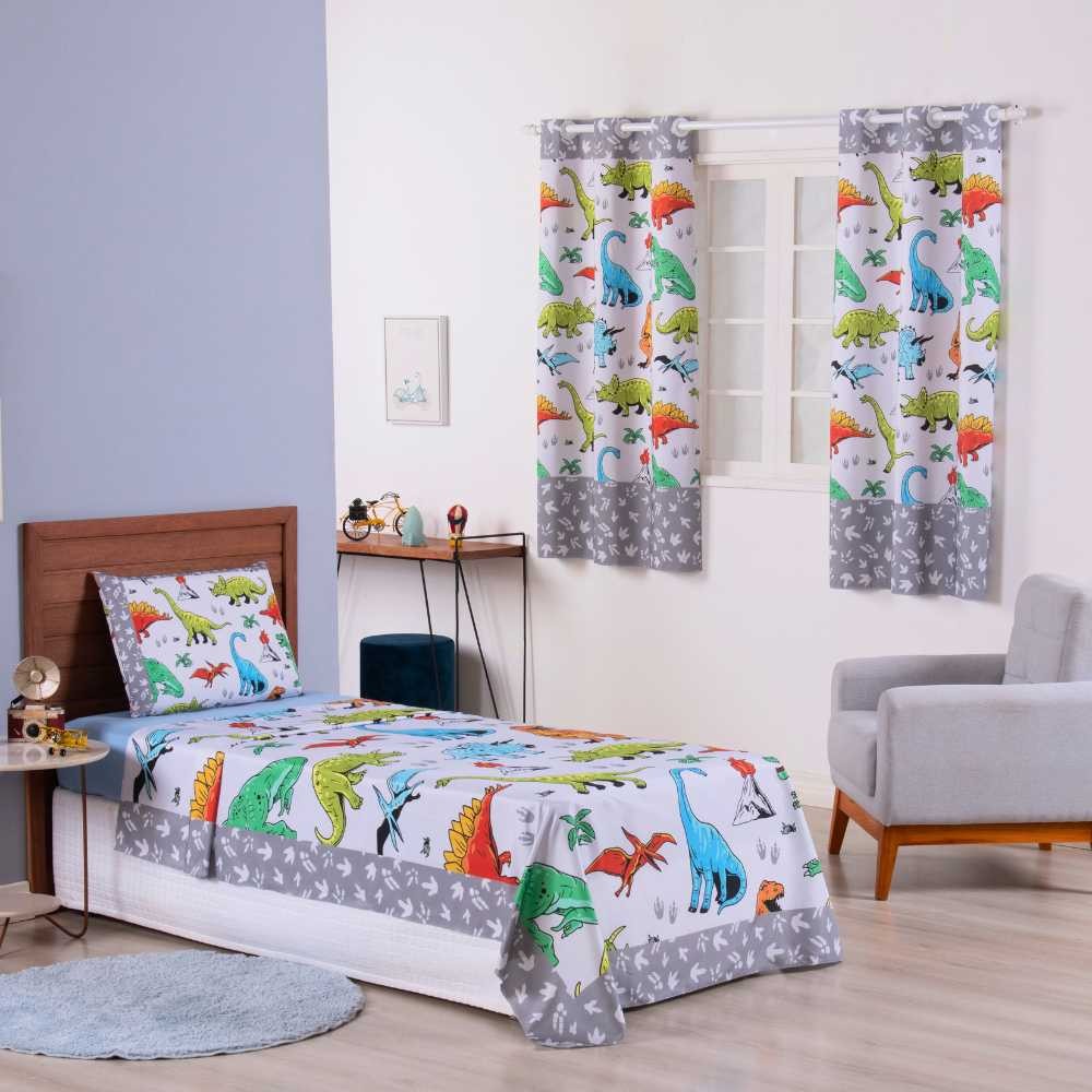 Kit 4 Peças Jogo de Lençol e Cortina 2,00cmX1,50cm Infantil - Dino/Princesa/Futebol - Menina/Menino