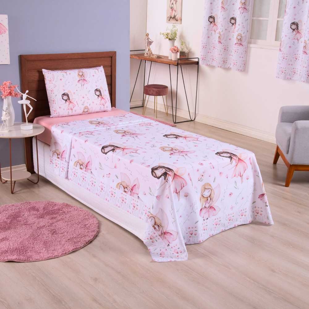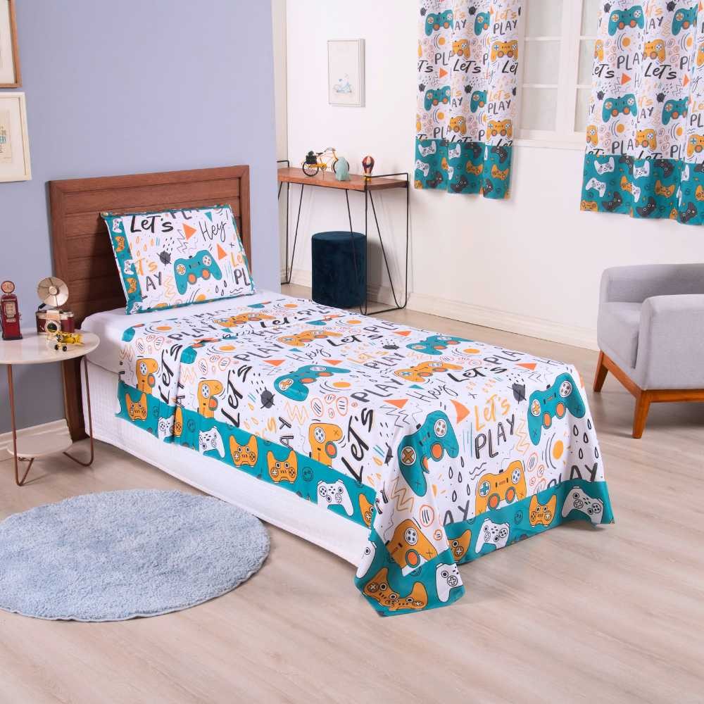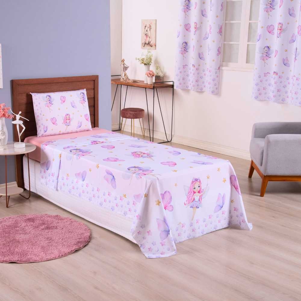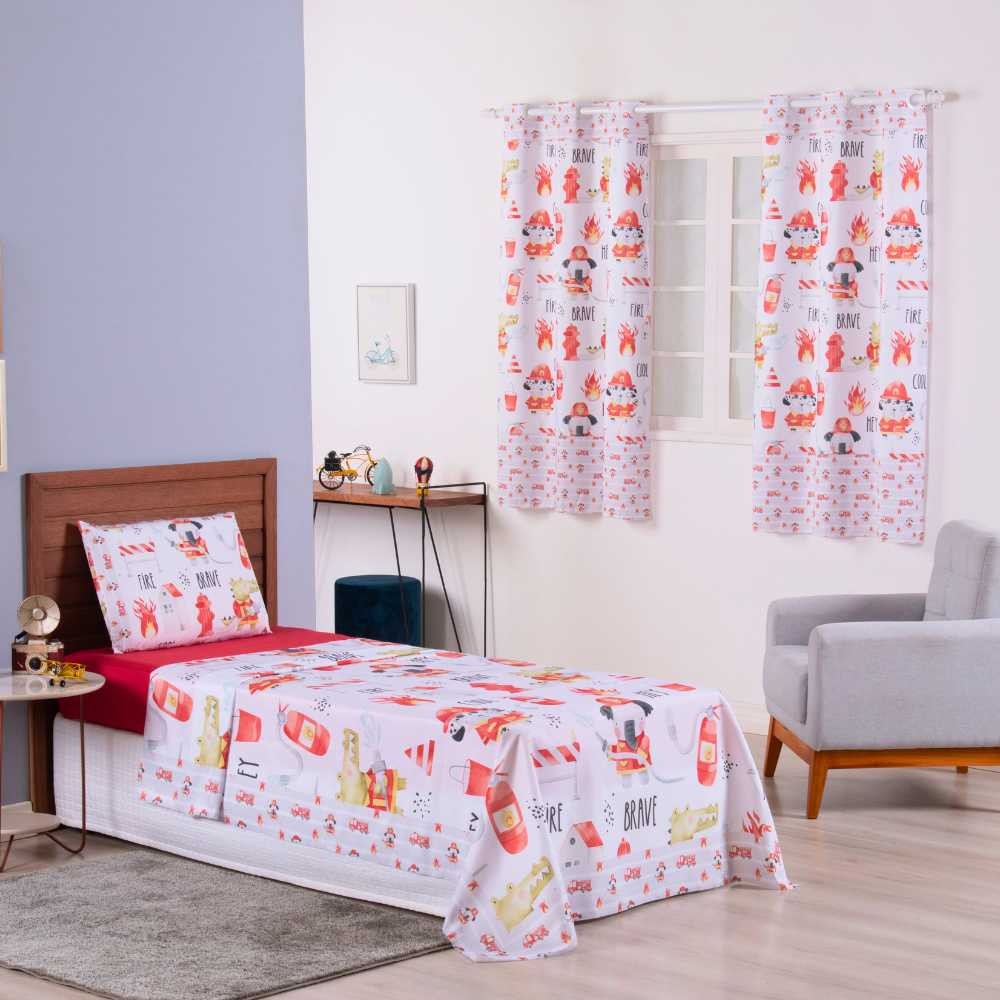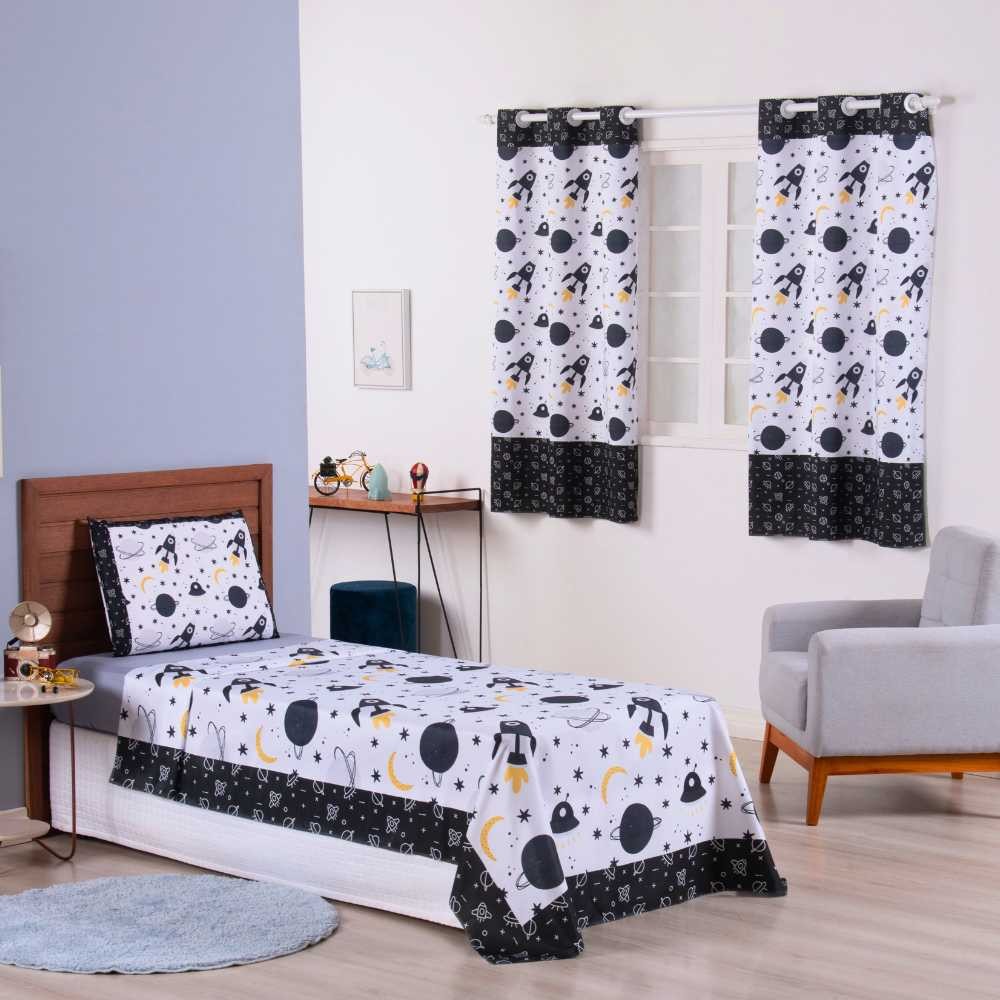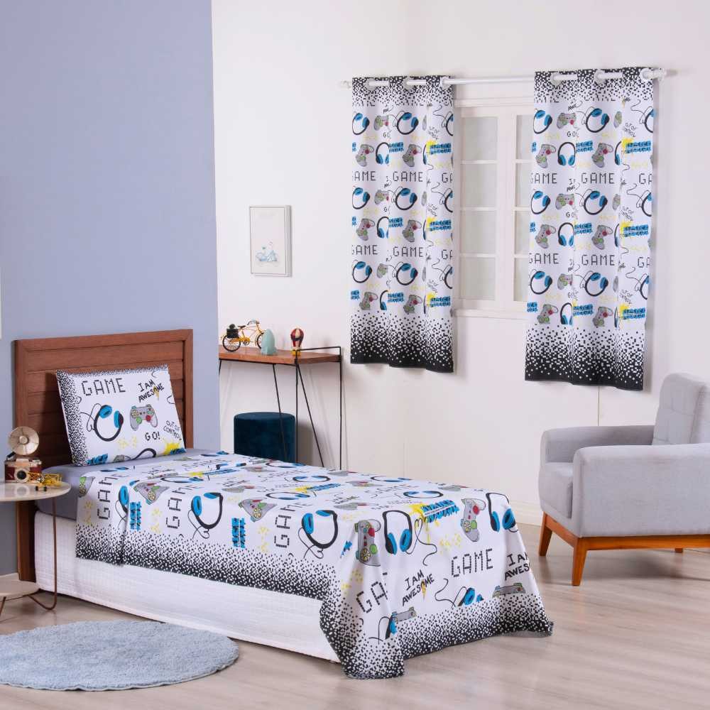 Kit 4 Peças Jogo de Lençol e Cortina 2,00cmX1,50cm Infantil - Dino/Princesa/Futebol - Menina/Menino