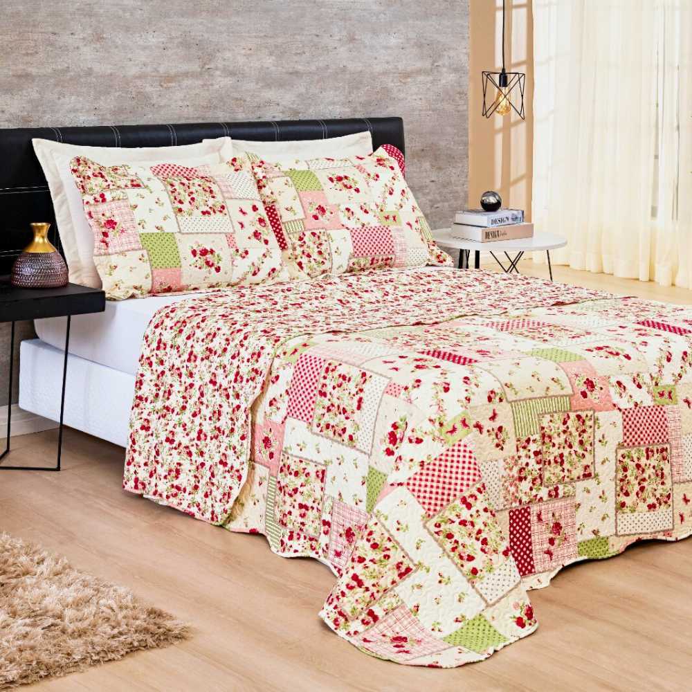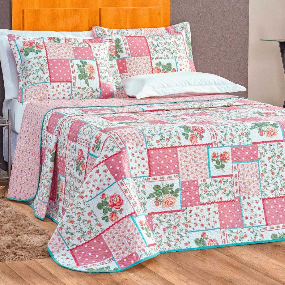 Jogo de Colcha Cobre Leito 3 peças Queen Estampada Dupla Face Bouti Matelado e Aba Americana