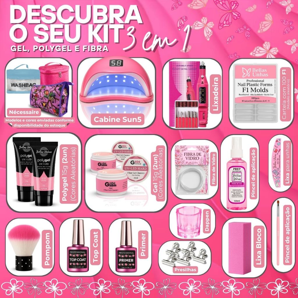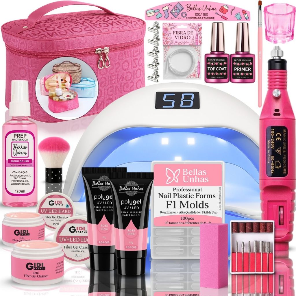 Kit Alongamento de Unha em Gel Polygel Poligel Fibra 3 em 1 Completo + Cabine Lixadeira Nécessaire