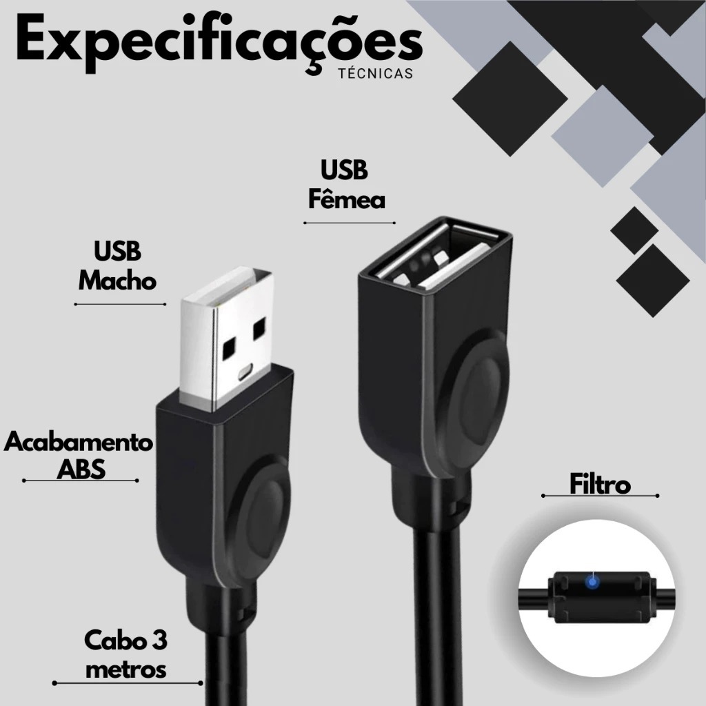 Cabo Extensor Usb 2.0 3 Metros Extensão Macho / Fêmea