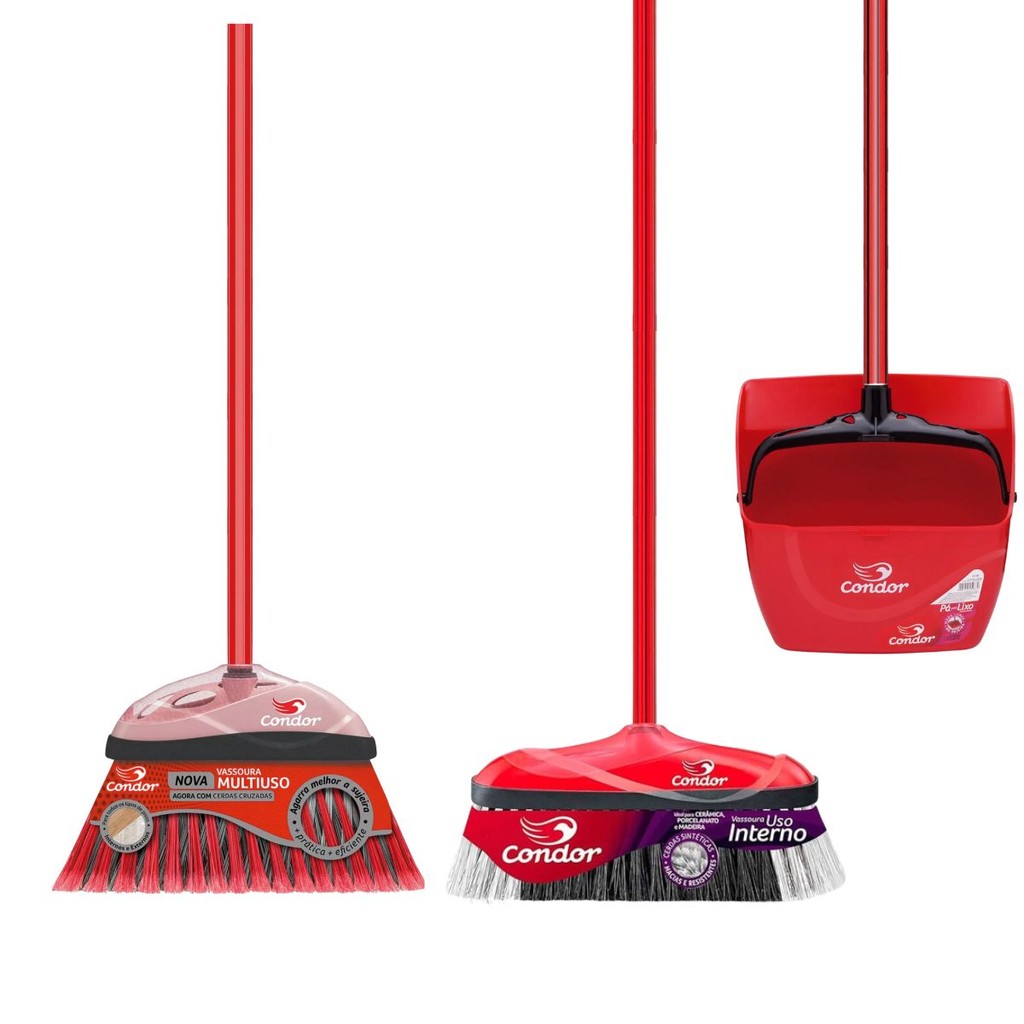 Kit Limpeza Completo 1 Vassoura Varre Muito 1 Vassoura Varre Fácil 1 Pá De Lixo Com Caçamba Com Cabo Qualidade Condor