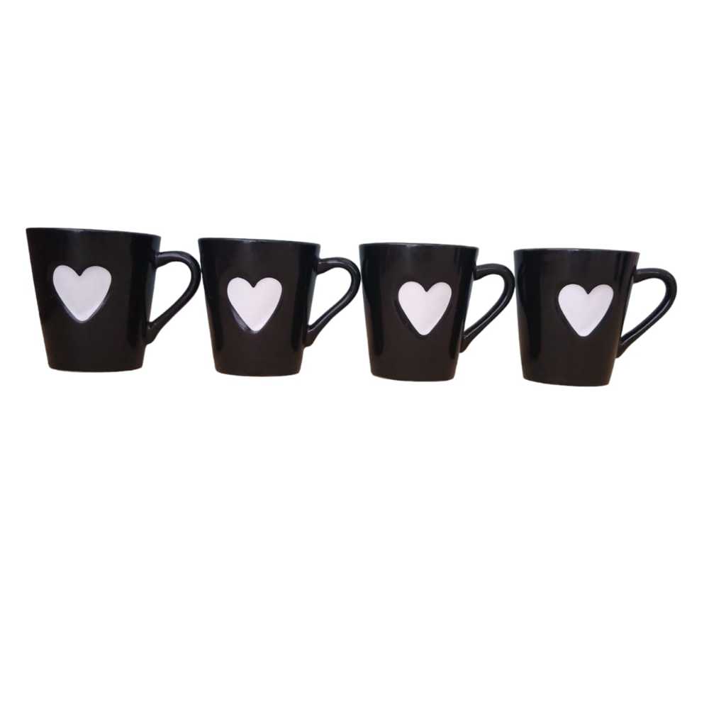Jogo Kit 4 Canecas Xicaras Café Porcelana Coração Relevo preto